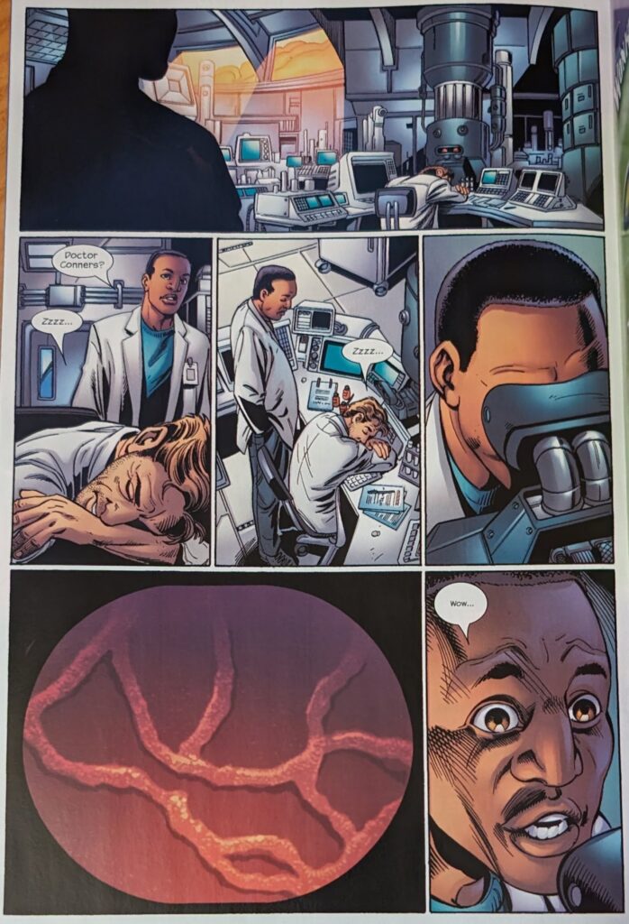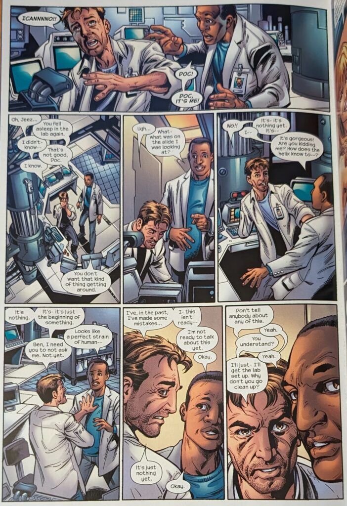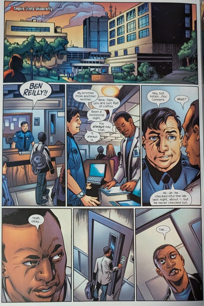 Purple Guy… maybe Boomerang despite not having any? He calls Spider-Man “mate” Anyway, he offers our man $20,000 to swing him to safety, but Spidey just webs up and Punisher up for the cops and leaves. The internet says that was, indeed, Boomerang. But he’s covered in weird little circles that look like octopus suckers, and he has no boomerangs? Well, anyway, next Peter’s off to see Curt Connors to get a cut patched up. He says Curt’s looking healthy, and Curt says they got their project funded for the year, and that he’s going to dinner with his kid, so it sounds like his life’s going better. Peter asks if he can see the project, but Curt reiterates that he’s going to see his son, and asks if they can do it tomorrow. Peter agrees and takes off. Then Curt goes back into his lab…
