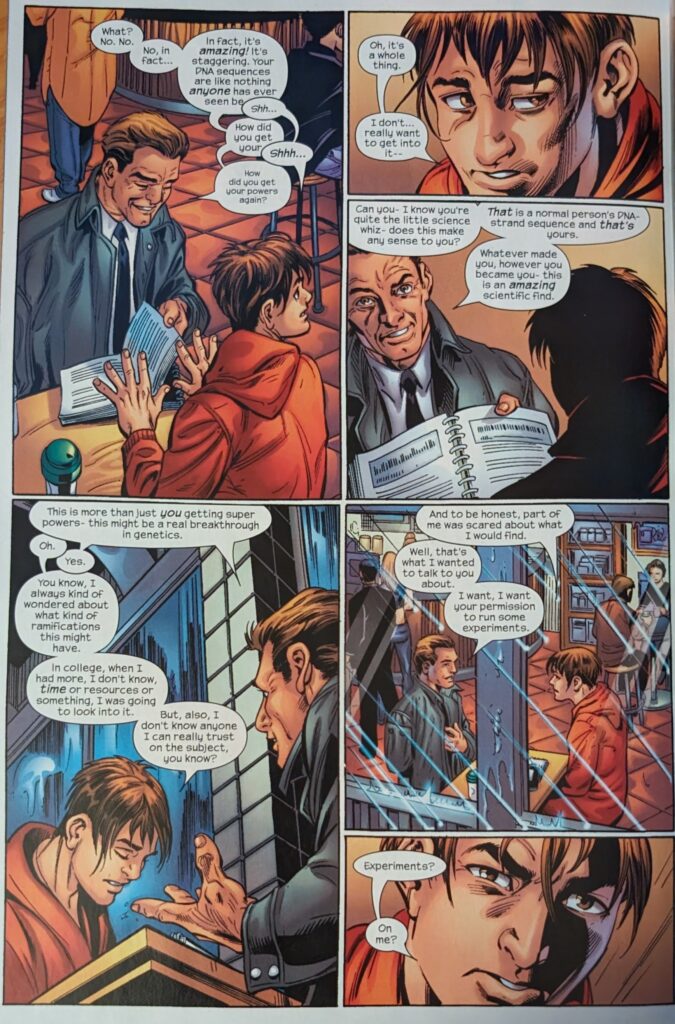 I gotta say, that’s some immaculately rendered stubble on Curt. That is a whole lot of little dots. Cut to Peter getting a call from Curt, desperate to meet and talk about his blood. Despite feeling terrible, Peter is convinced it’s important. So they meet at a diner or something, and Peter is really sick, but Curt explains that he’s been looking at Peter’s blood. Peter immediately assumes he found something terrible.