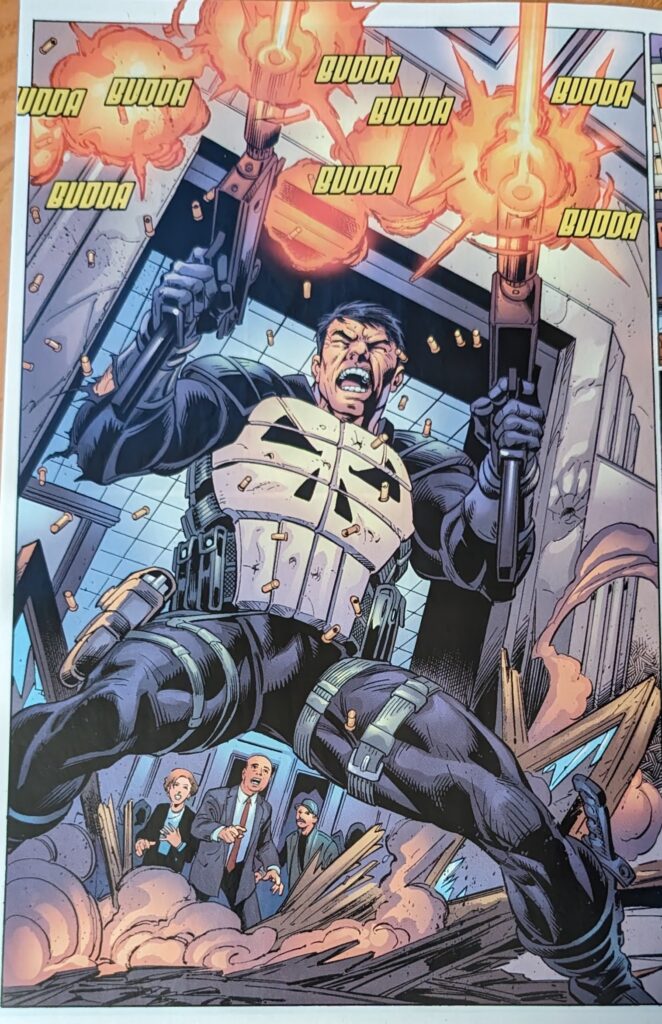 Ultimate Punisher is trying to execute an unnamed villain in a purple suit for robbing a bank, but Spider-Man is on the scene. He really has to go to the bathroom and wishes he wasn’t, tho.