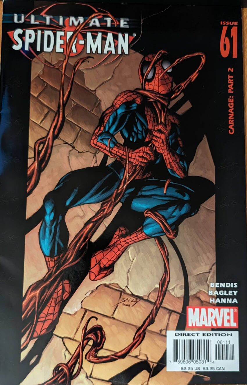 Ultimate Punisher is trying to execute an unnamed villain in a purple suit for robbing a bank, but Spider-Man is on the scene. He really has to go to the bathroom and wishes he wasn’t, tho.
