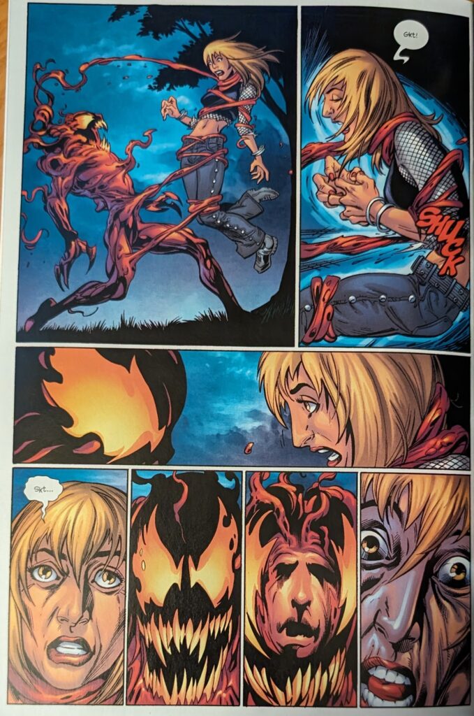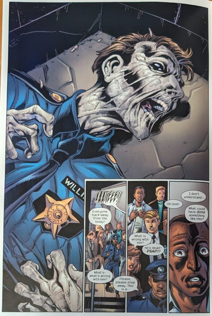 Quality horror material. Can you believe it? They just killed Gwen. I mean, dying is Gwen Stacy’s job, but it seemed like we’d moved past that. On the other hand, she didn’t really seem to have a place in the book. The book’s focus seemed to narrow in recent years. Flash & Kong quietly got shuffled to the sidelines. After such a huge entrance, Gwen sort of did, too. So maybe it was inevitable, after all. This was, obviously, a massive shock at the time. Gwen Stacy or not, I don’t think anyone saw it coming. It’s real, too, she’s dead. Bendis would later publicly admit he thought this was a mistake. But he didn’t think it fast enough to save her.