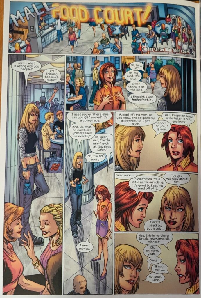Gwen and MJ sit down and have a nice chat across a 2-page spread with a stupid card from some bound-in crap in the middle of it. Bendis said he got into these 2-page spreads to try to control where ads appeared in his book, tired of an ad being stuck in the middle of a scene, and they just went, “Ok, here’s a random thing in the middle of your scene instead.” Gwen assures MJ she has nothing to worry about between her and Peter, saying he’s like her “superhero little brother.” They agree Aunt May is really cool, and seem to bond a little. For all that Gwen’s been in the book for almost 50 issues, these 2 haven’t interacted all that much. Meanwhile, an arguing couple is interrupted by seeing a creepy little red guy in an alley, who proceeds to hit them with long red tendrils and suck the life out of them.