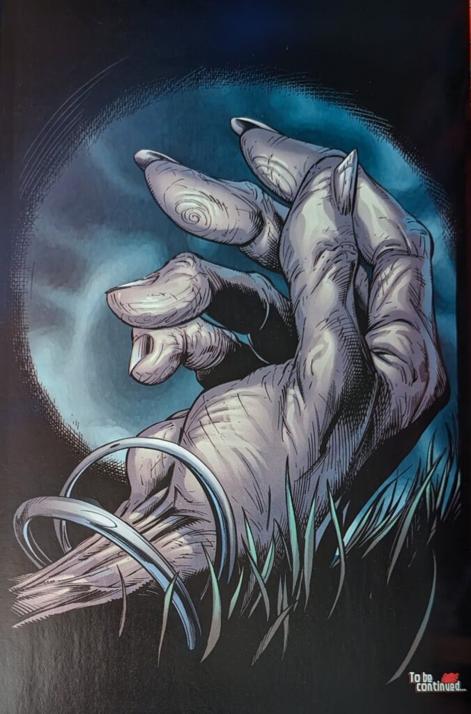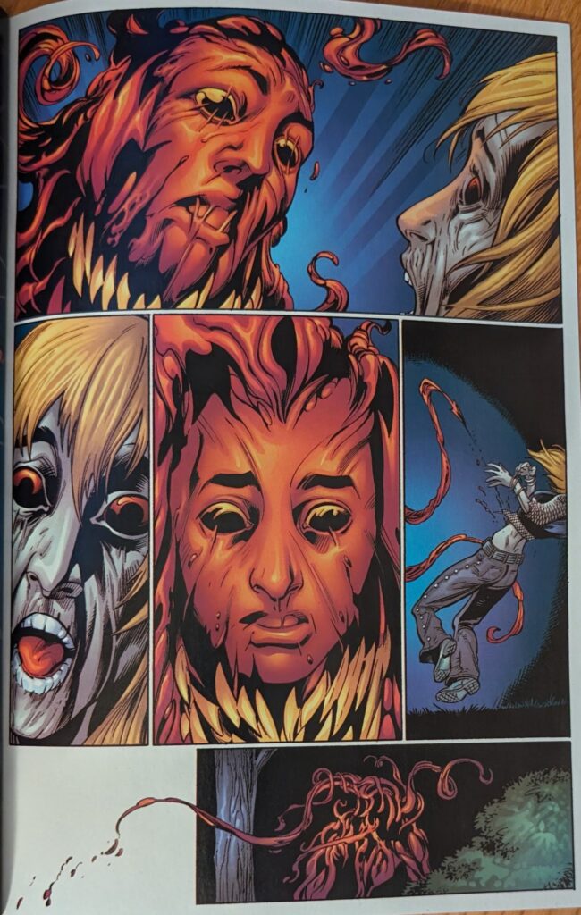 It’s a pretty substantial redesign when you consider it came from the co-creator. The flowing blood pattern is gone, the chest lights up, only 2 fingers per hand, and he has real teeth, like Venom, instead of the black ones, which most artists had already started doing to regular Carnage, anyway. I thought his original maw was much cooler looking and that those guys were messing up, myself, but in this case, anything goes. Back at ESU, Curt Connors arrives to find his lab a crime scene. Captain Jeannenene De Wollllffeeeee wants to know where he was tonight, and then Ben Reilly is led out by cops, to Curt’s shock.