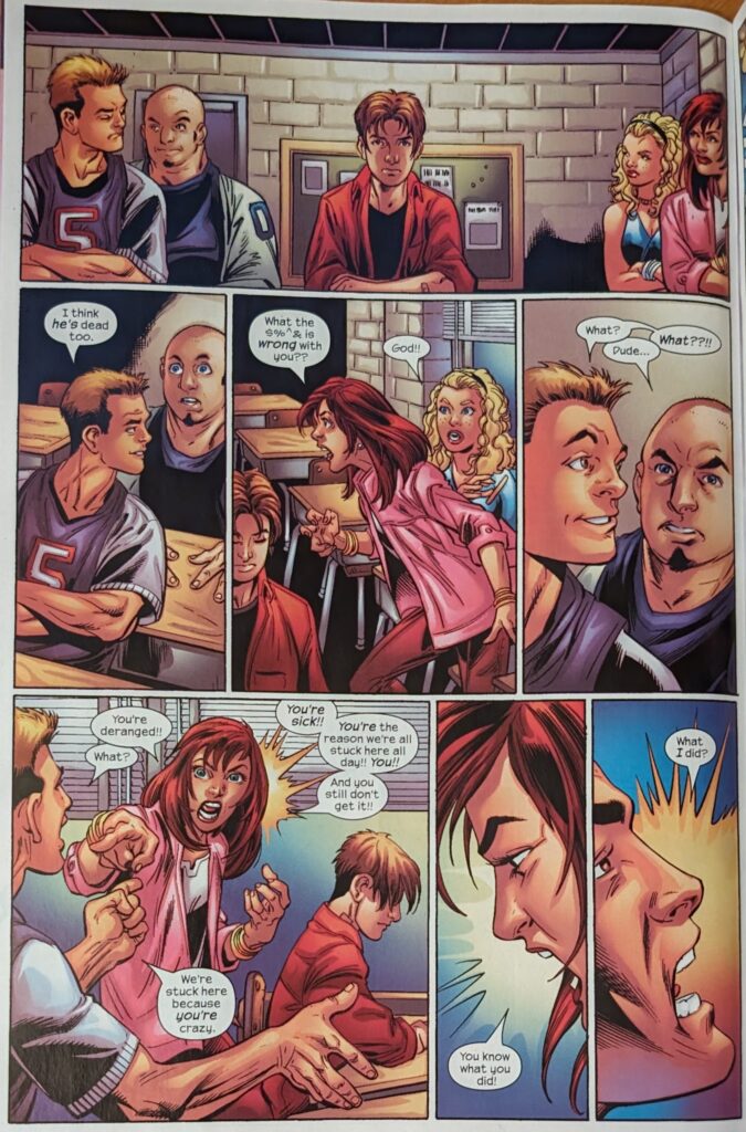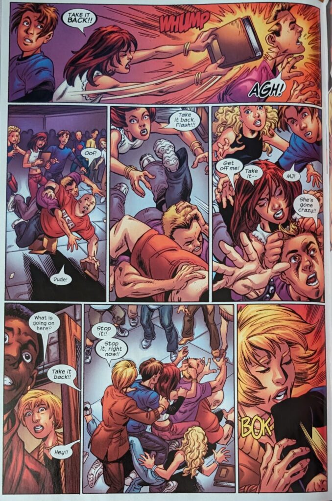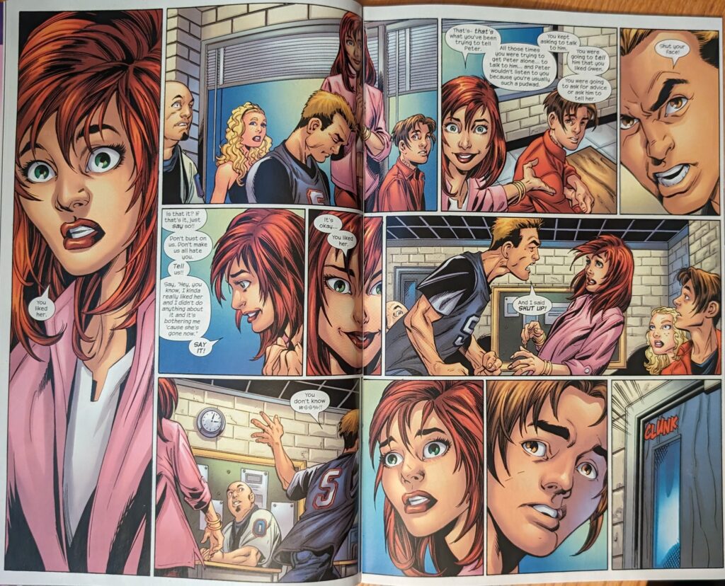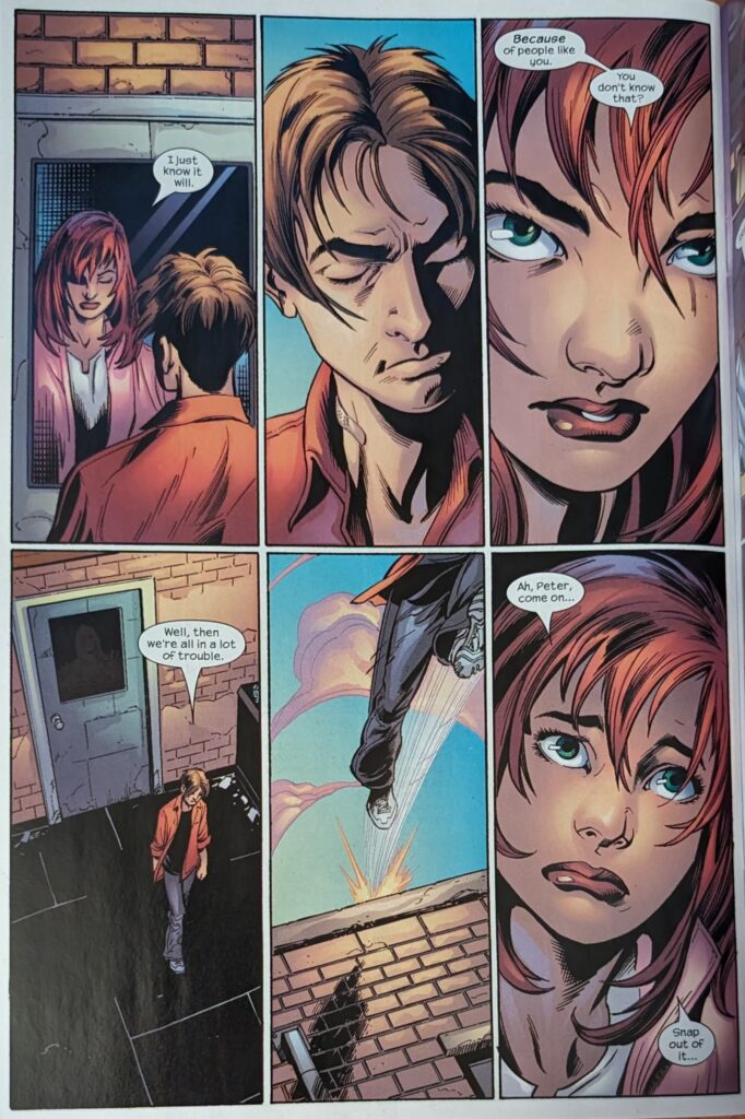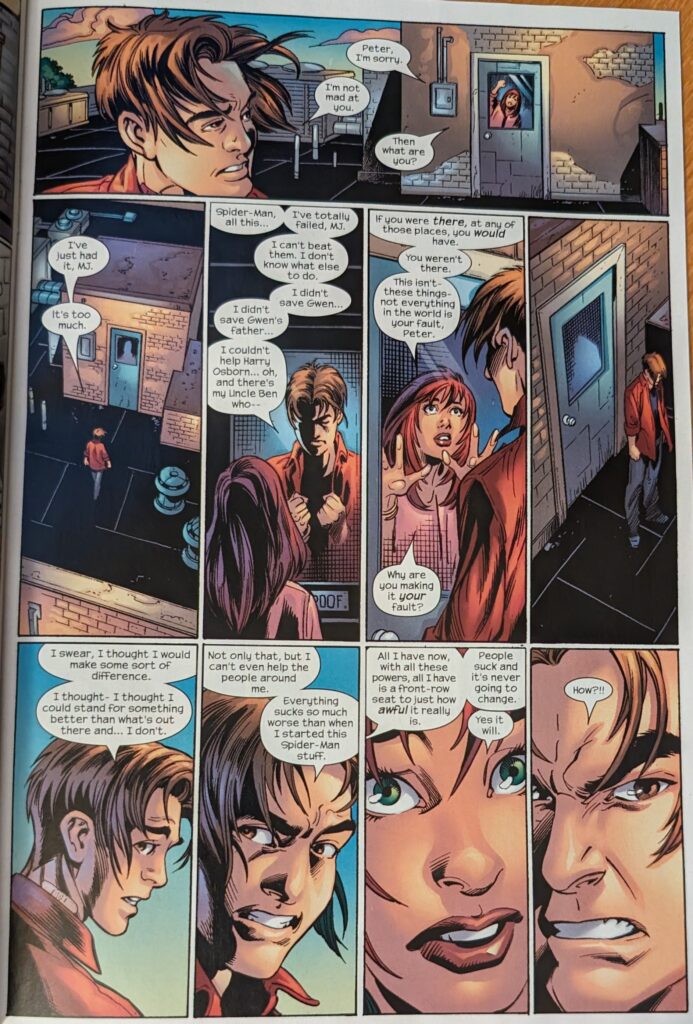 Flash really is a class act. Back in the present, MJ wants to know why. She asks him why he’s still acting like a jerk despite the death of someone he knows. Flash initially won’t give in to admitting he has feelings, but she slowly breaks him down. Which, if you think about it, is such a delightful reversal of the Mary Jane stereotype from the classic comics. It was MJ always pretending nothing was wrong back when the original Gwen died, and now we have her trying to force Flash to stop doing the same.