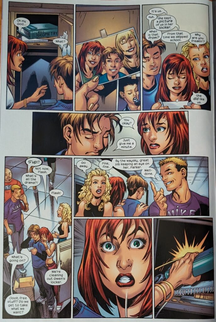 Now that we’ve established the Breakfast Club of it all, we flashback to yesterday, and more specifically, to the principal letting Peter & MJ into Gwen’s locker to clean it out. He offers some words of sympathy, and then leaves them to it. Liza comes by right as they’re getting the locker open.