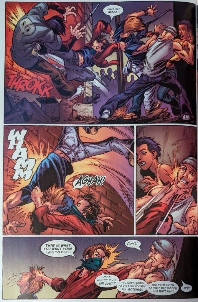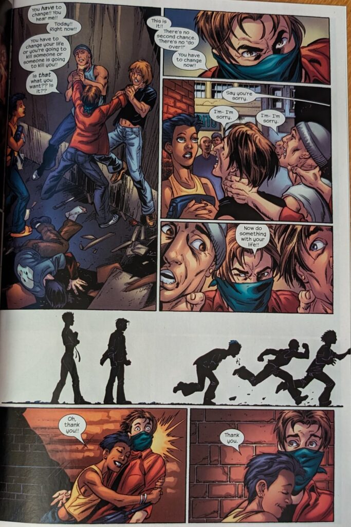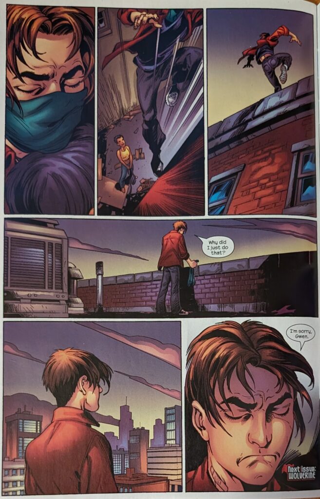 It’s a pretty realistic portrayal of someone in his position, at his age, I think. The other Peter was at least 20-something when his Gwen died, but this one’s still 15, and he just keeps losing people. Leaping around the rooftops, Peter inevitably encounters a mugging. He tries his best not to get involved, but it’s pretty serious down there.