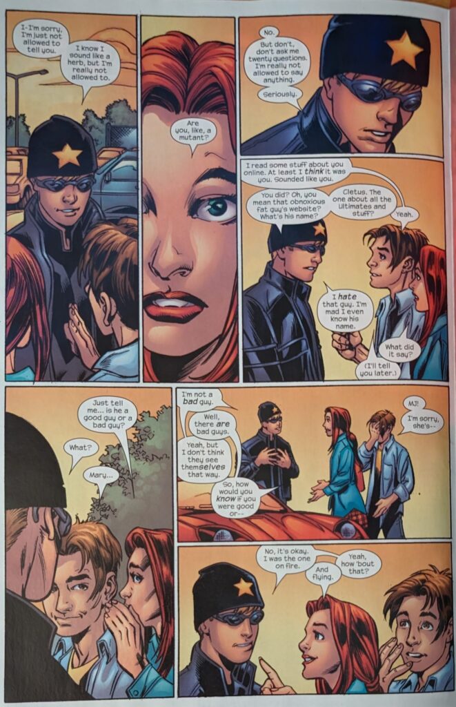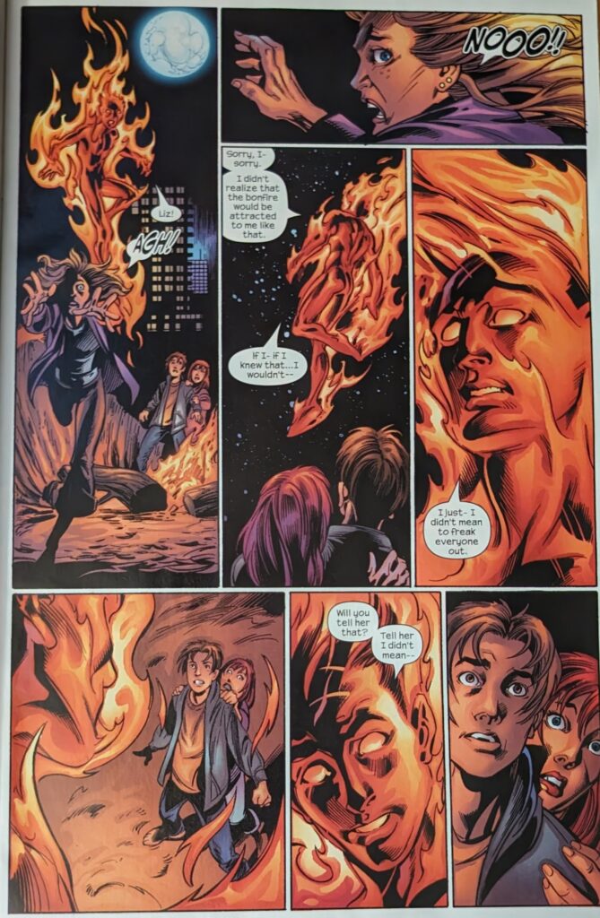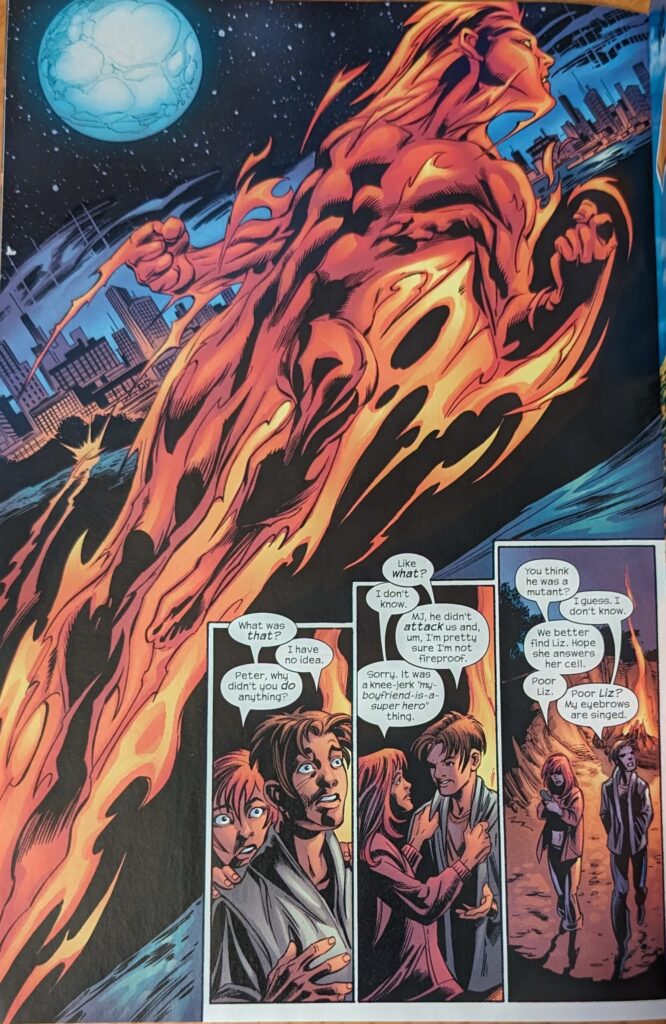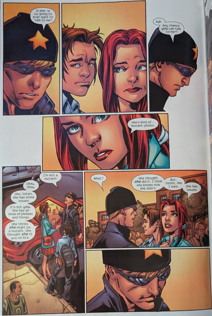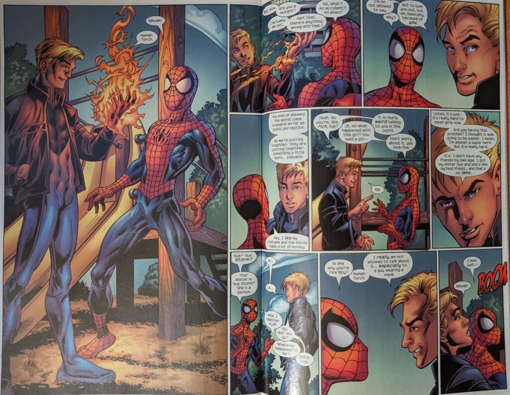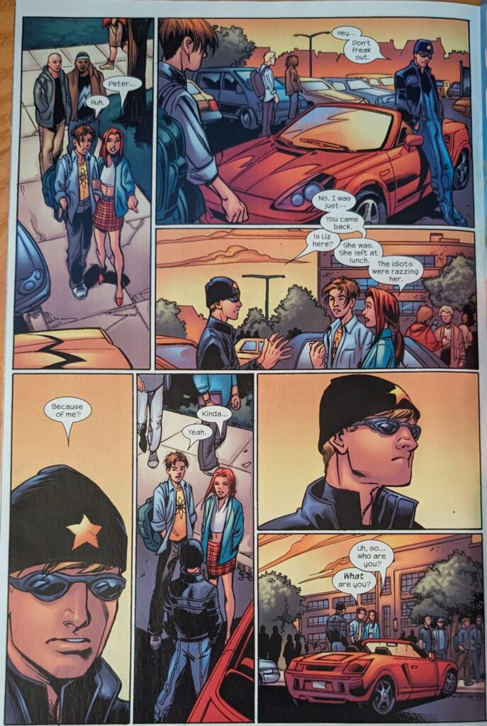 Later that night, Johnny’s back in the Baxter Building, clearly upset, and Sue finds him angrily flipping through the TV. He says he won’t go back to that school, and she very compassionately wants to know what happened. Next day at school, Liz and MJ stand outside, Liz not wanting to go in knowing, what will happen. Under a sign that says “Tandy Bowen for school president” (That being Dagger of Cloak & Dagger), Flash yells, “I hear your boyfriend’s hot, and Liz is laughed at by a hallway full of people. Later, Johnny has arrived in a flashy car (Very on brand), and MJ & Peter find him in the parking lot, asking if Liz is around. MJ says she left at lunch, and Johnny finds out she’s getting crap because of him. MJ wants to know what his deal is.