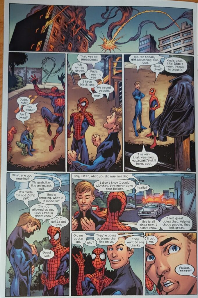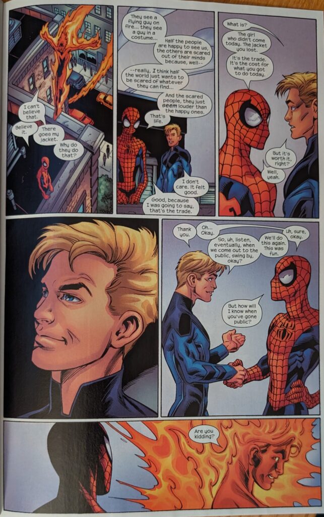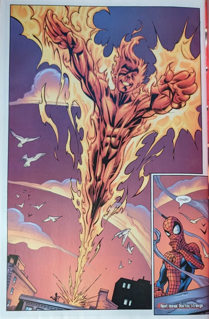 Of course there’s a “boom.” Spidey says he’ll see Johnny later and swings off, but Johnny is not letting this chance go by. He leaves his jacket on a pole, yelling for no one to steal his jacket, and flies off after our hero. Who arrives at a burning building. Classic superhero stuff. He’s saving people. A lady tells him she’s a babysitter as Johnny arrives, the baby of course still trapped in the building. Classic stuff. Johnny asks what he can do, and then an explosion almost gets Spider-Man.