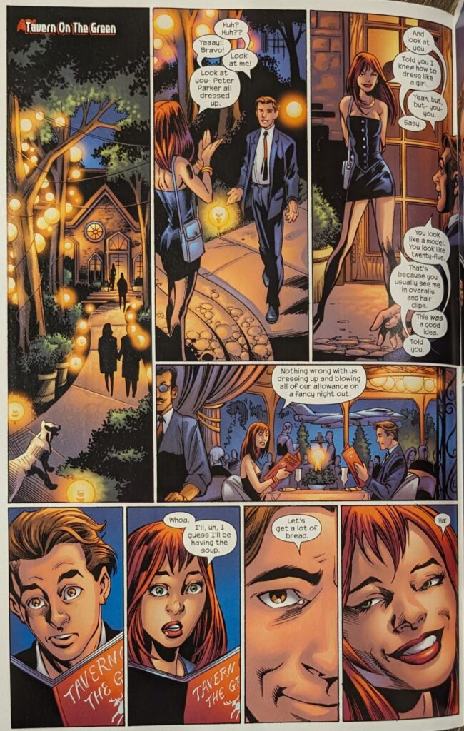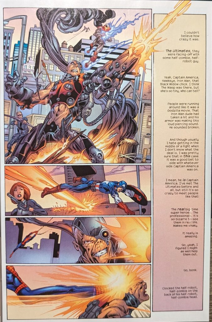 Well, that’s cute. Peter flashes back to being in class, not paying attention, unable to think about anything but Gwen’s empty desk, which he was refusing to look at, and knew he had to get out of there. So, he left school, became Spider-Man, and swung around. He talks about how he still doesn’t know if he wants to be Spider-Man, how he thinks he’s too young, but he keeps putting the suit on. This is the first variation on “Peter wants to quit” since ASM 50 that isn’t pure torture. Because it’s not the 50th time Peter ever decided to quit, it’s the first. And since it’s Ultimate Spider-Man, while we can assume Peter will eventually realize Spider-Man is part of him, not only do we not know how or when, it could conceivably go on a lot longer, and hi quitting could be a lot more dramatic, than was possible in every previous instance of “Peter wants to quit.” So it’s not just a rehash of the worst Spider-Man trope, even though it also is. Anyway, he stopped a pickpocket, and then decided to go put in some hours at the Bugle to try to pay for this date, when he saw smoke, and beneath that smoke…