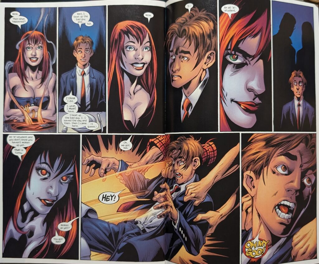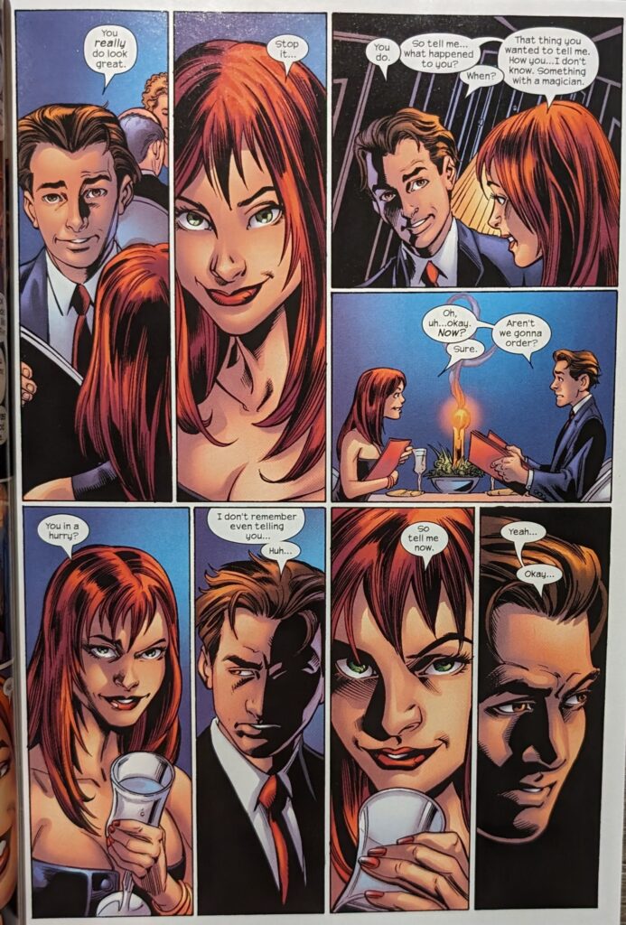 May in the real MJ’s wedding dress is a fun touch. Well, we must be dealing with Ultimate Nightmare, not to be confused with the later miniseries called Ultimate Nightmare. And still, I don’t remember this story. I’m really surprised by this.