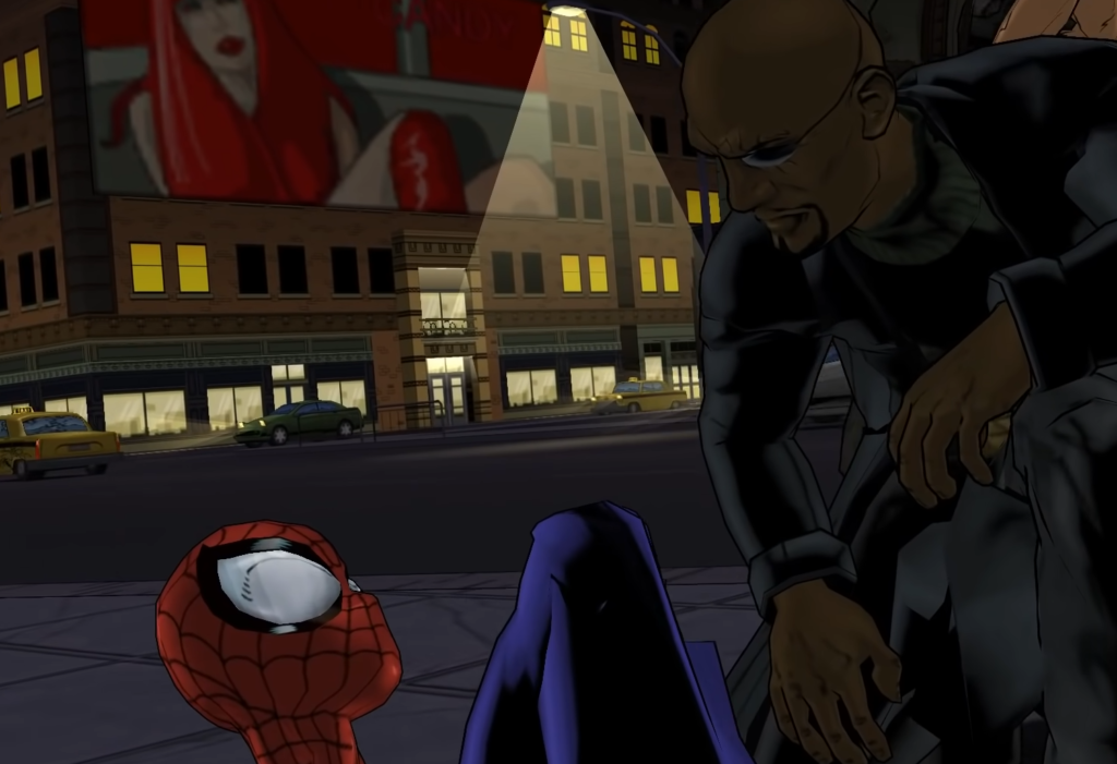 So Venom is electrocuted, as we saw in the comics, and then it’s 3 months later, and we’re into the new story. Peter is begging MJ for his suit back, but it’s got a hole in it, and she’s not done sewing it up. So he heads home to get his webshooters (so the player can learn more about the controls). It must be said, Bendis made much of being involved in voice casting, and Peter has this really nasal, annoying voice that kind of sucks. When he gets home and gets his webs, he’s just in time to hear a news bulletin about the Shocker out doing his thing. So he swings by and gets the suit from MJ, and then heads to embarrass Shocker for the 3rd time, I think?