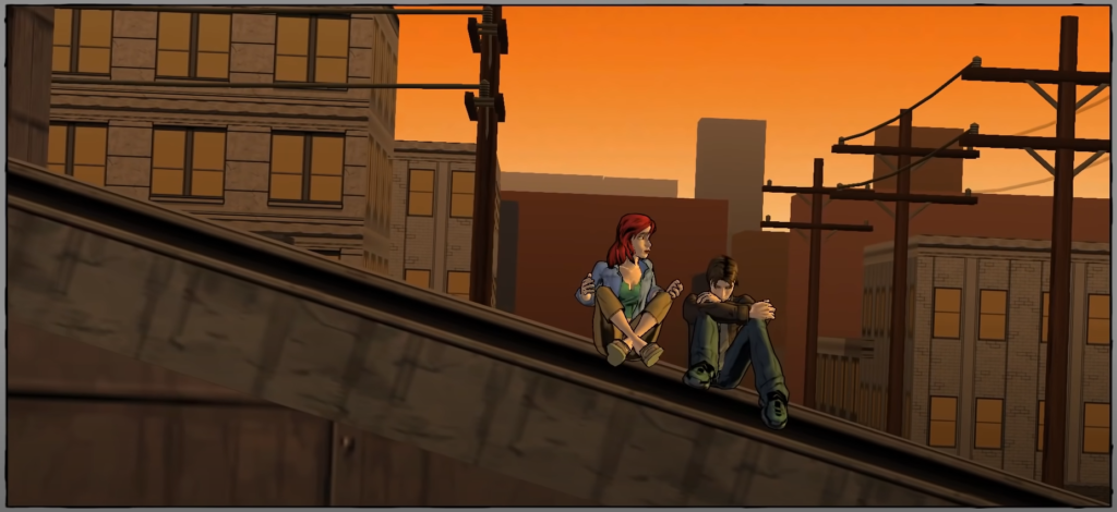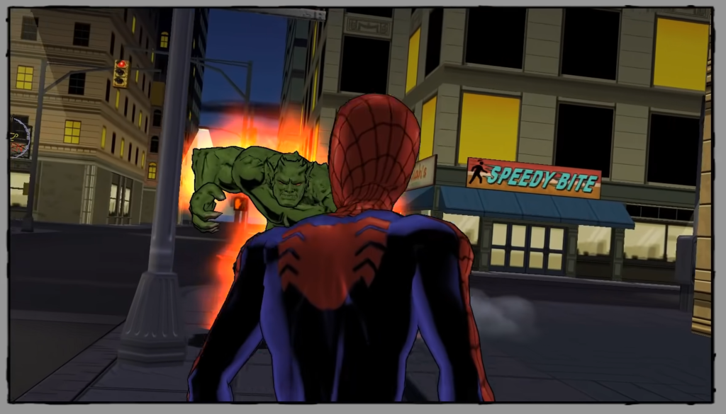 The game opens with some recap material, which is all the game engine recreating/animating scenes from the comic, which is pretty cool. It shows you Peter getting bit, then swinging around, then quickly recaps the Venom storyline…