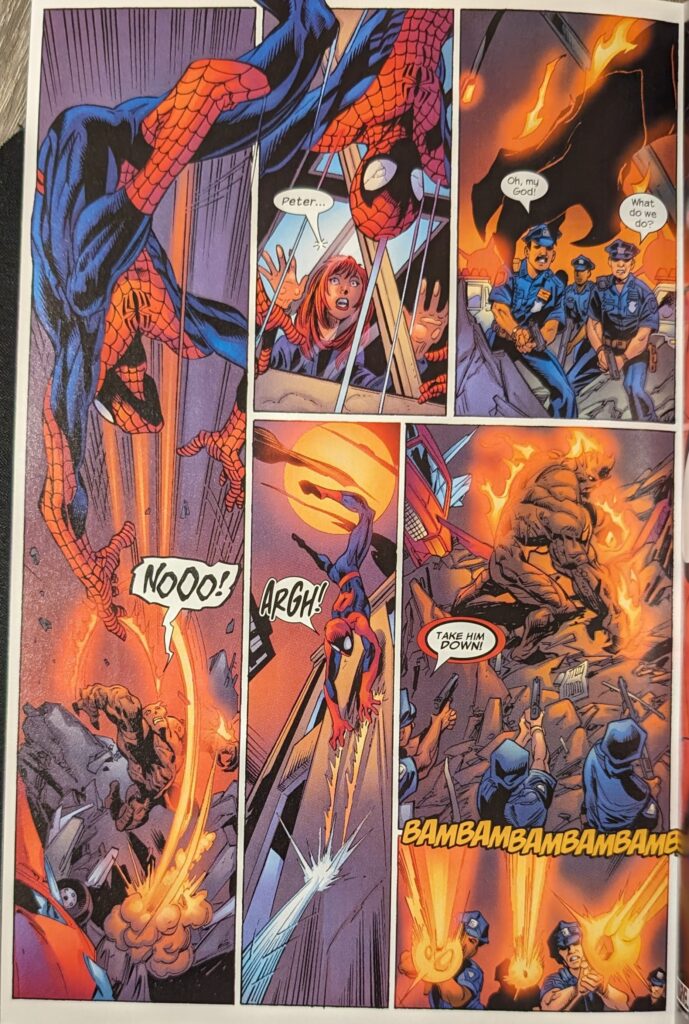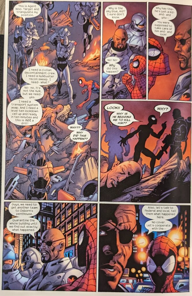 Whatever Harry is telling himself will have to wait, as we go see Nick Fury being interviewed at the Triskelion when the news finally reaches him of the battle. He quickly learns his agent monitoring Harry is unresponsive, and then, while scrambling Hulkbuster units, is told by Agent Woo that they tested and re-tested Harry’s blood and DNA for months, and found no trace of Oz in him. “And yet, here we are,” says Nick, as we return to the battle, where Spider-Man is trying to save a news crew too stupid to run for their lives as Fury & his Hulkbusters show up. Harry just bellows “Thank you” as they threaten to put him down, and Spider-man rushes to try to prevent Harry’s suicide-by-cop.