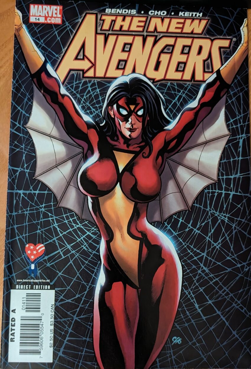 Before we get to the dreaded The Other crossover, we got a few other things to check out, starting with a 2-issue, Spider-Woman-focused New Avengers arc unfortunately drawn by Frank Cho. This story features one of the most infamously childish things he’s ever drawn, which is saying a lot for that guy. If you think women were comically oversexualized in his previous appearances on this blog, you ain’t seen nothin’ yet. Not thrilled about it, but here we are. He inks himself, and Jason Keith colors. Bendis, of course, stays on as writer. For years! We begin at the Daily Bugle, where intrepid reporter Kat Farrel has gotten a phone call from her Mom, telling her to look out her window. Kat is not really paying her mother much attention, but does look out the window, and soon she and most of the Bugle staff are staring at Avengers Tower, which now has that big Sentry stuff on top. Then we can get back to the cliffhanger from last issue, where Cap wants to know who Jessica is working for.
