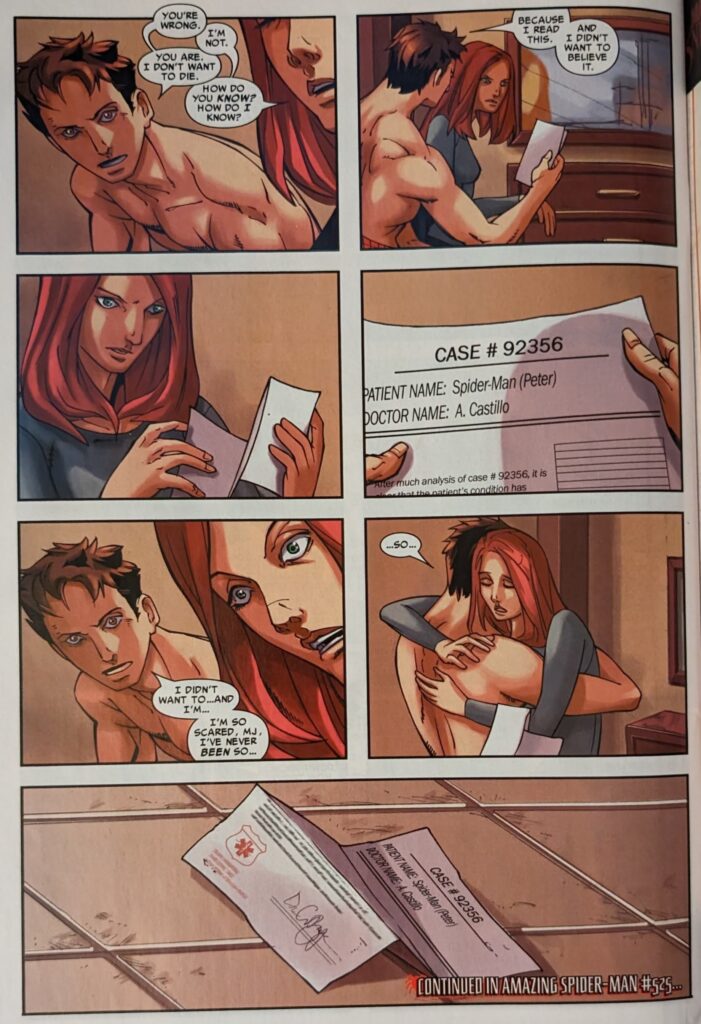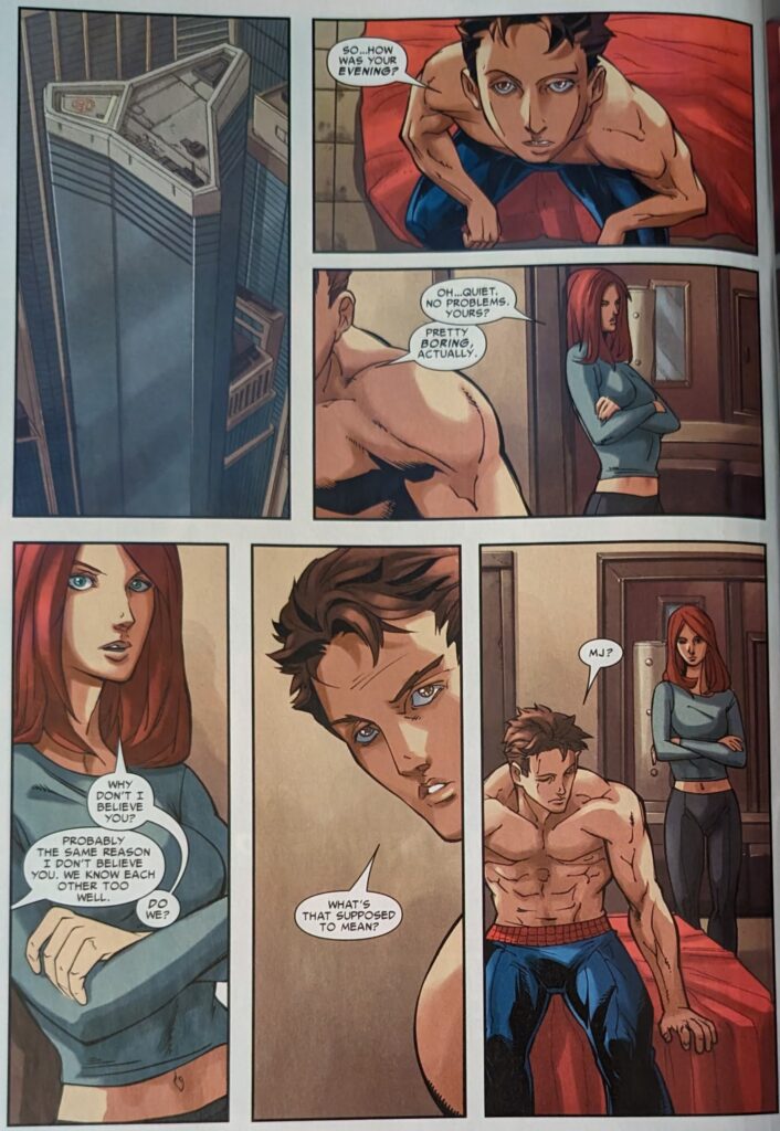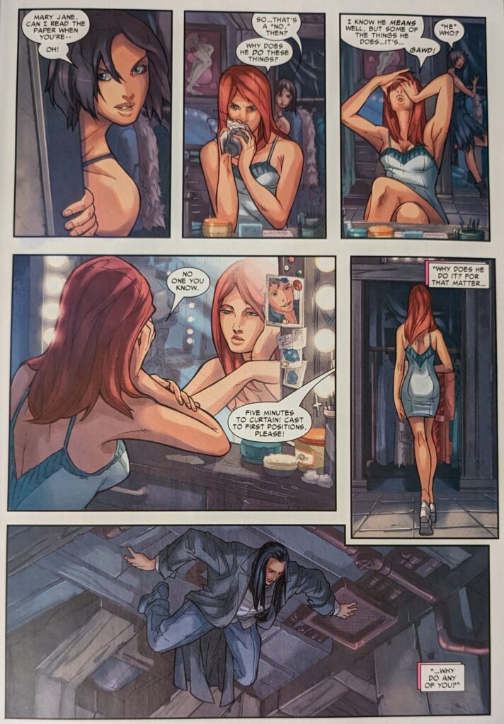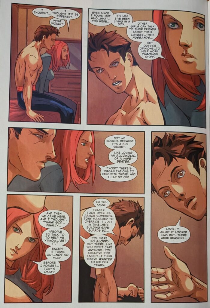 MJ says she knows his reasons, and it’s survivor’s guilt. She tells him he’s been trying to die in a fight ever since Uncle Ben died, because he’d rather be with his dead uncle than his live wife. She says he wants to die, and she doesn’t know how to live with that. Hey, gang, WHERE THE HELL IS ALL THIS COMING FROM?