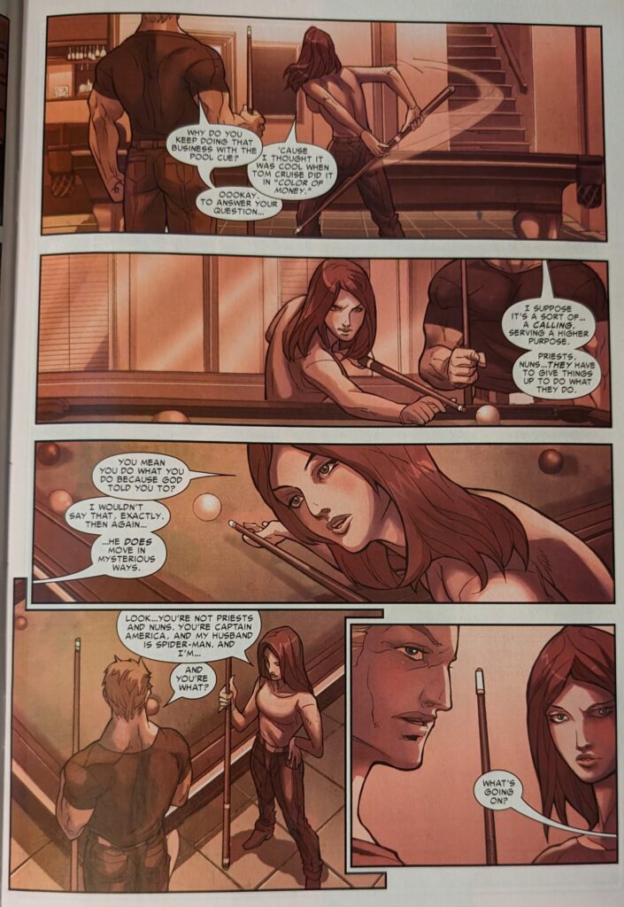 We go to what I guess is a flashback of MJ playing pool with Steve Rogers, asking him why superheroes do what they do, comparing them to Don Quixote.