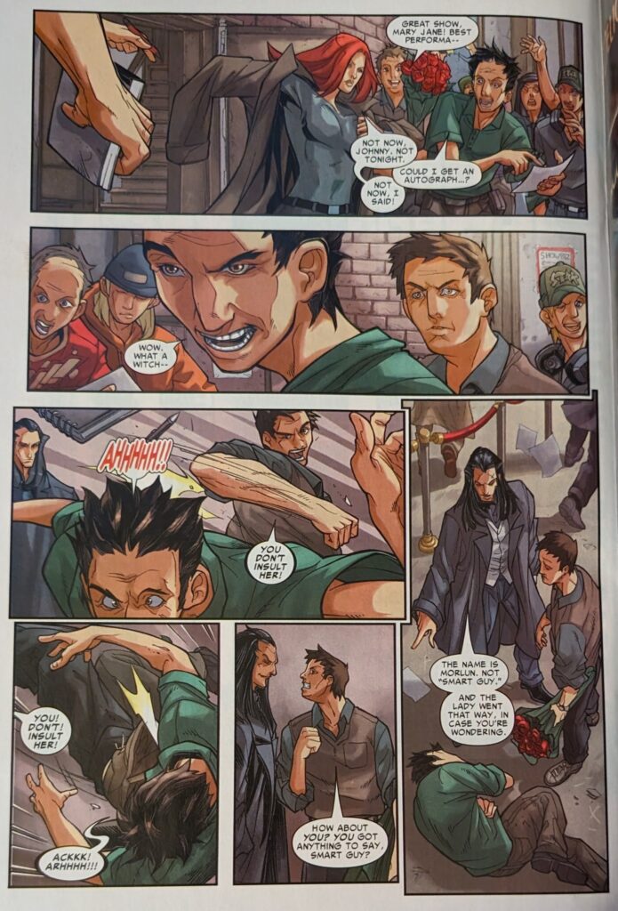 She dashes out to get a taxi, and Morlun appears, standing in front of a cab, forcing it to stop for her, and quietly threatening the driver to give her a ride. MJ calls him a lifesaver. He says it’s the first time anyone’s ever called him that as the cab drives off. I know a lot about what happens in this comic, I skimmed several of the issues in the store, but I have no idea what Morlun’s angle with MJ is. Well, I guess MJ has returned home from there, and…