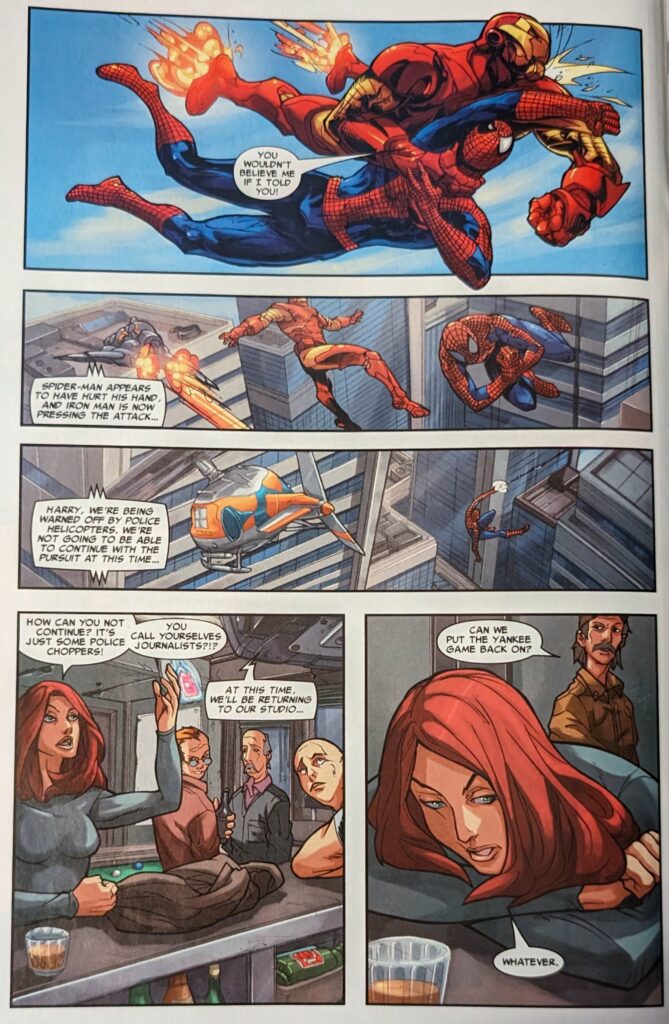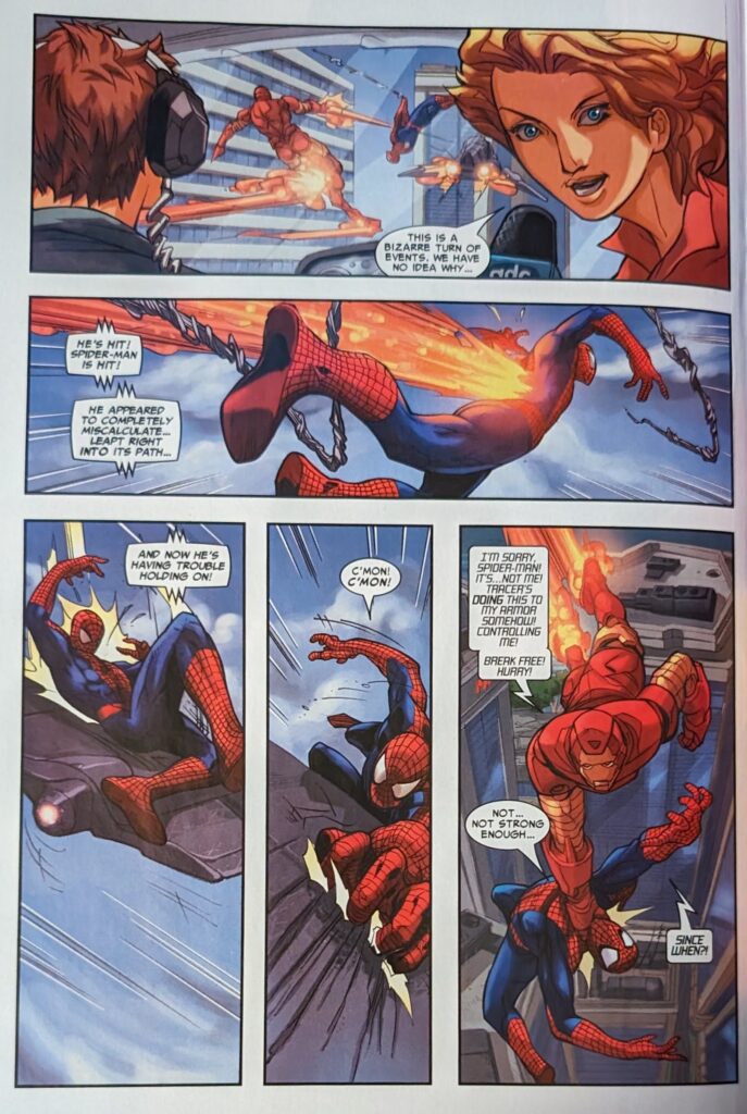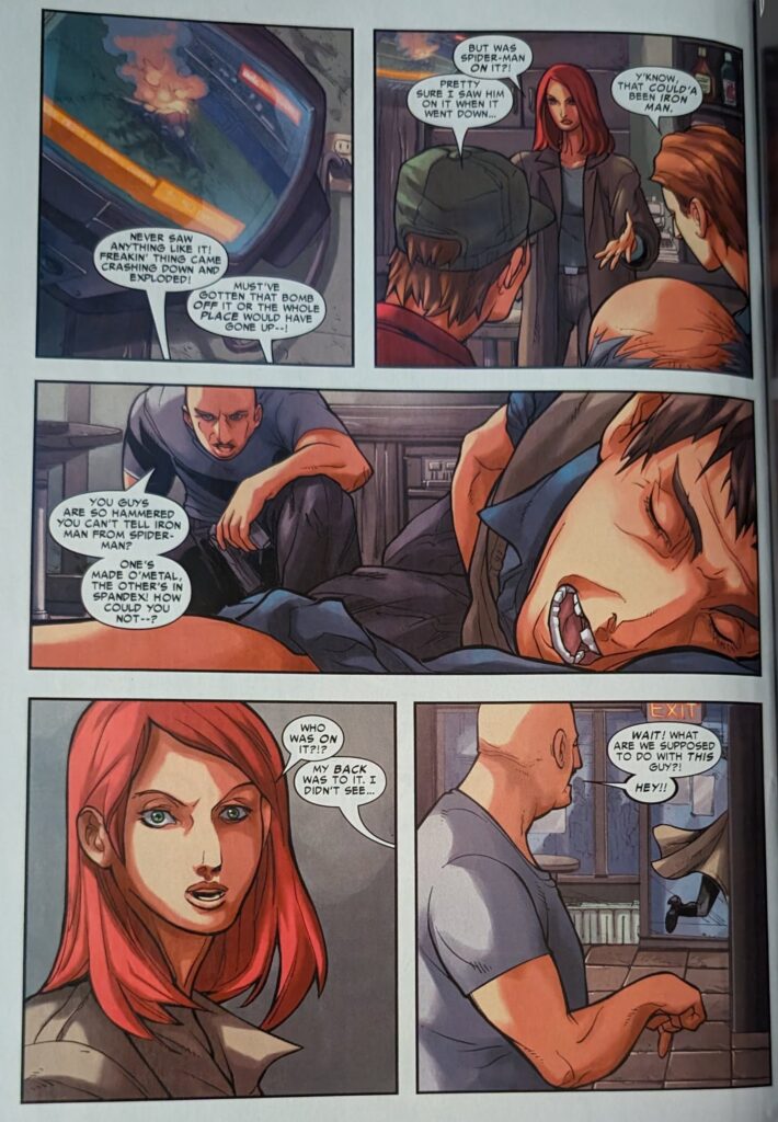 Well, that can’t be good. MJ bursts into a nearby bar and offers the barkeep $20 to let her watch the news. Spider-Man has apparently disarmed Tracer when we’re told Iron Man shows up, but to attack Spider-Man rather than help him.