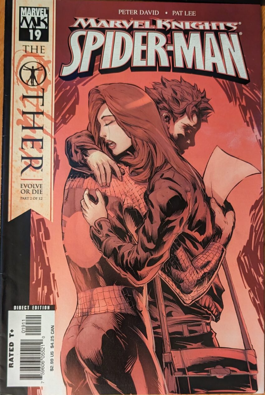 She dashes out to get a taxi, and Morlun appears, standing in front of a cab, forcing it to stop for her, and quietly threatening the driver to give her a ride. MJ calls him a lifesaver. He says it’s the first time anyone’s ever called him that as the cab drives off. I know a lot about what happens in this comic, I skimmed several of the issues in the store, but I have no idea what Morlun’s angle with MJ is. Well, I guess MJ has returned home from there, and…