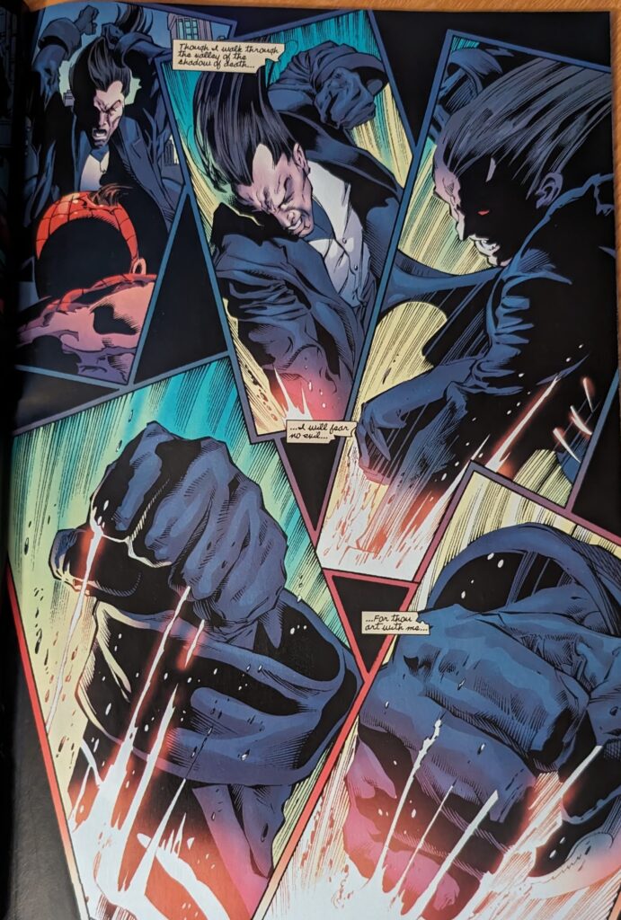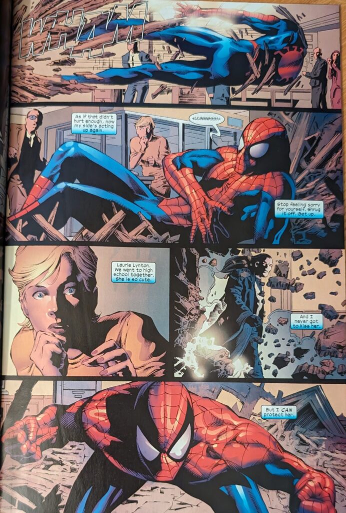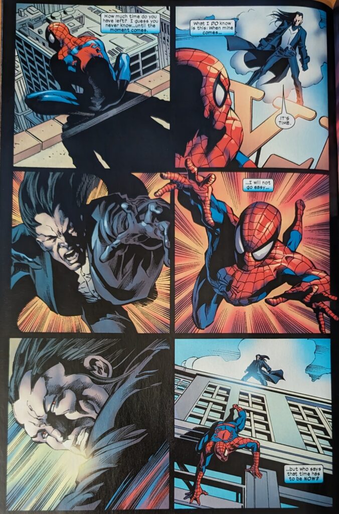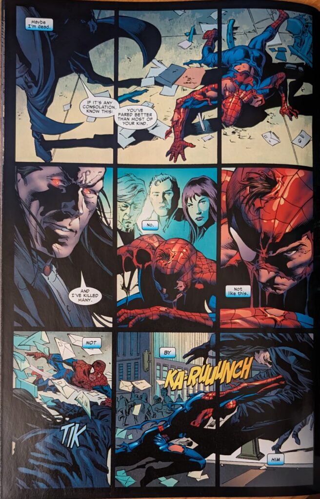 Who’s that guy in the middle? Steve Rogers? Spider-Man then spends 3 pages beating the crap out of Morlun. It’s so funny to me, stuff like this. Morlun completely demolishes a Spider-Man incapable of defending himself… But then Spidey gets his 2nd wind or something, and does the same to Morlun. Feels very realistic. Anyway, he thinks he’s winning, and then Morlun says he’ll tell Spider-Man’s family he did his best…