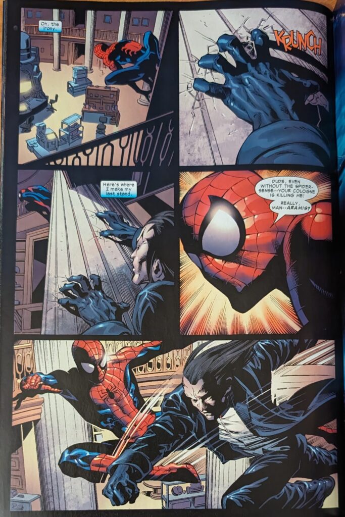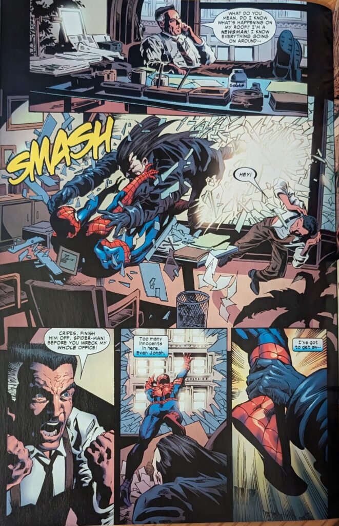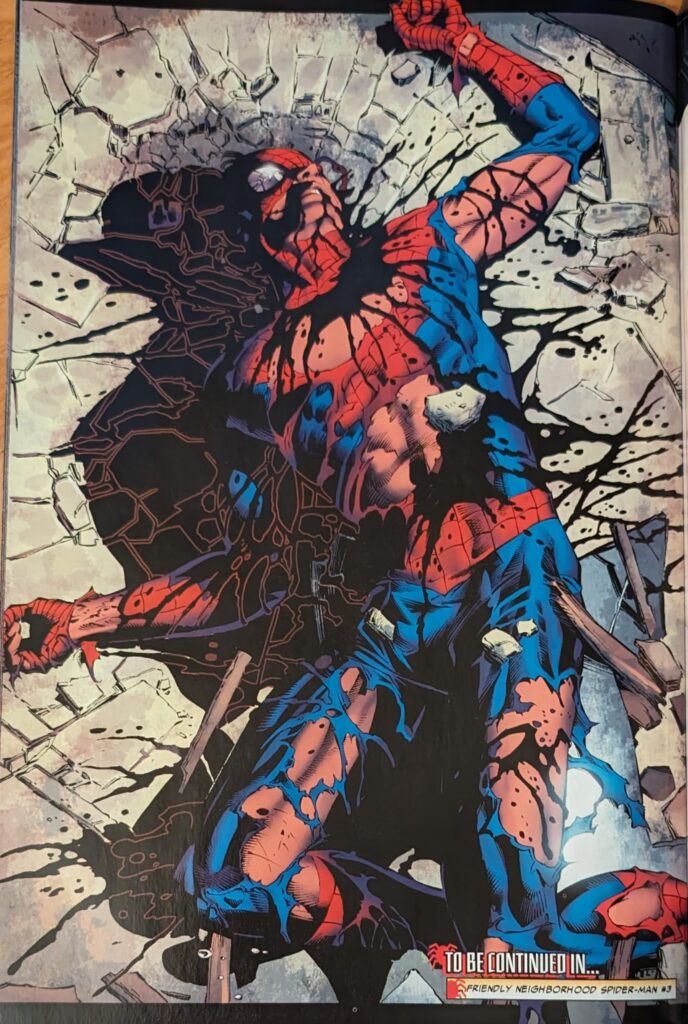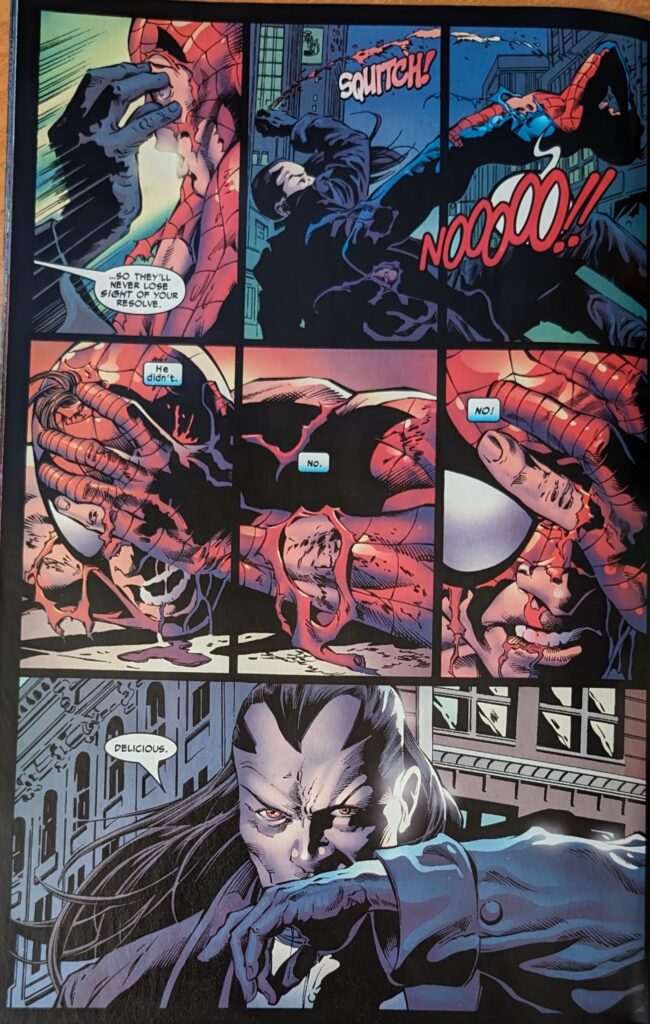 Morlun spends 3 pages throwing Spider-Man through walls and pillars and stuff, until they end up back outside, where he keeps on really beating the crap out of our hero.