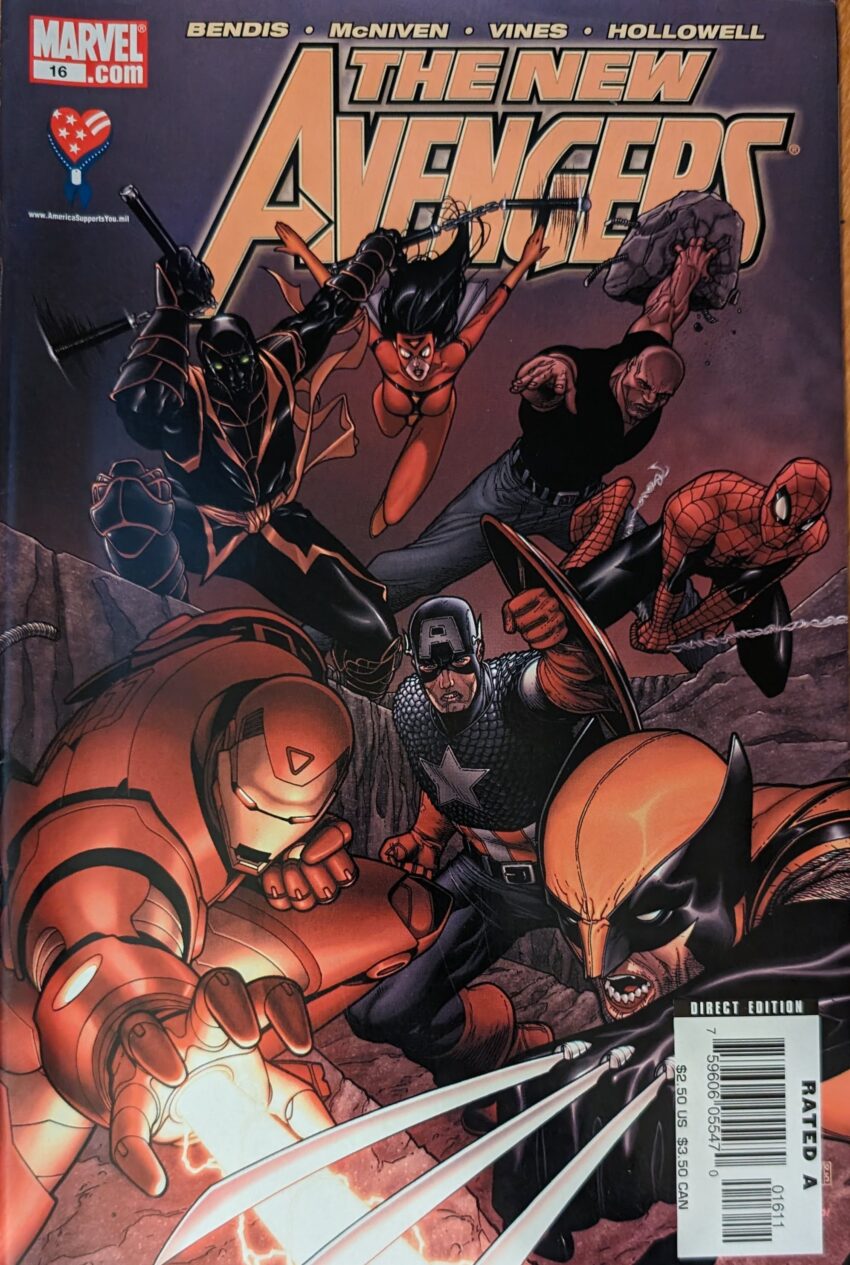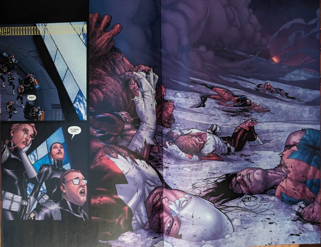 Bendis jobbing all of Alpha Flight out to this new threat caused quite a bit of uproar. On the one hand, it’s just Alpha Flight, but on the other hand, the guy who did Avengers Disassembled destroying a Claremont/Byrne creation from the golden era of X-Men didn’t go over well. But it’s comics, most if not all the characters on this spread are alive now. There follows a spread where the President of the United States tells Hill to get the Avengers on this, and she tries not to because she doesn’t like them, but she’s overruled.