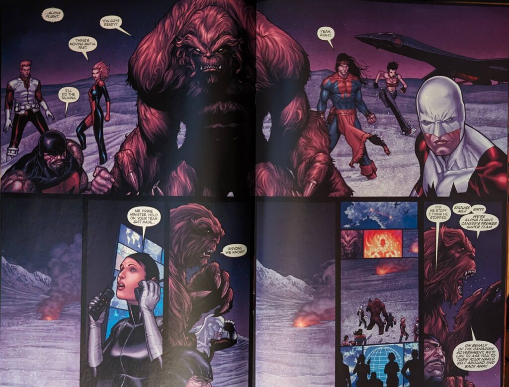 “Eileen Harsaw” was one I had to look up. She’s one of the parade of generic, lame mutants Rob Leifeld made up on X-Force called “Phantazia.” Apparently not anymore, though. The red alert is what happened i Alaska. Hill gets briefed on how the entire town was wiped out, and they get eyes on the flamin’ guy via some agents in the area, but he sees them from 22 miles away and the line goes dead. Hill is scrambling for someone to send out there, and remembers Canada’s premiere super team.