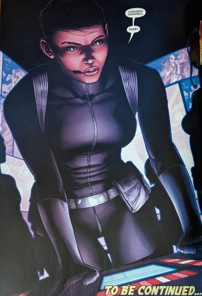 For those playing along at home, that’s 7 panels in 8 pages to show us this guy getting zapped. Pretty self-indulgent. Meanwhile or later or something, Maria Hill, Director of SHIELD, takes a video call from Tony Stark. She seems mad he made the New Avengers public, but that’s not what she wants to talk about. She wants to talk about the House of M. Which she calls that, of course.