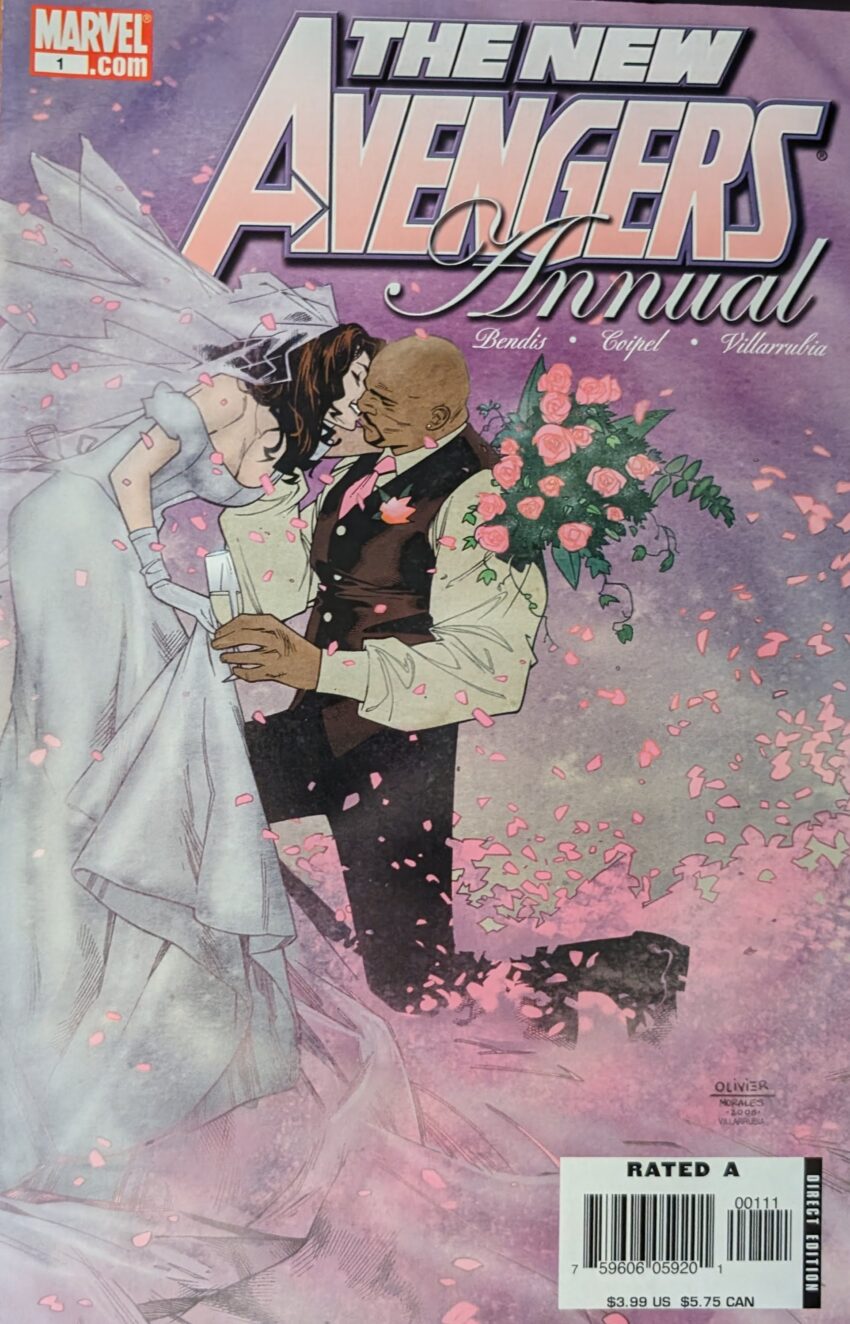 Let’s close out this block with a good comic. Look at that lovely cover. It’s the wedding event of the century from your pals Brian Michael Bendis, Olivier Coipel, uh, 8 inkers and 3 colorists, wow. I guess that’s what it takes to get an oversized issue by Olivier Coipel to market on time. Couldn’t do it at all today, as complicated as his art’s gotten. The inkers are Drew Geraci, Drew Hennessey, Livesay, Rick Magyar, Danny Mikki, Mark Morales, Mike Perkins & Tim Townsend. The colorists are June Chung, Richard Isanove and Jose Villarrubia. I remember liking this comic, but now I’m just wondering how drastically the art will shift with each change of personnel. But we don’t open with the wedding, with the couple, or with the Avengers, we open on an awkwardly cropped reprint of the cover to 1967’s Avengers #45 by John Buscema and Vince Colletta. The weird crop is clearly to remove the logo and cover copy of the first appearance of the Super Adaptoid, which a floating word balloon names.