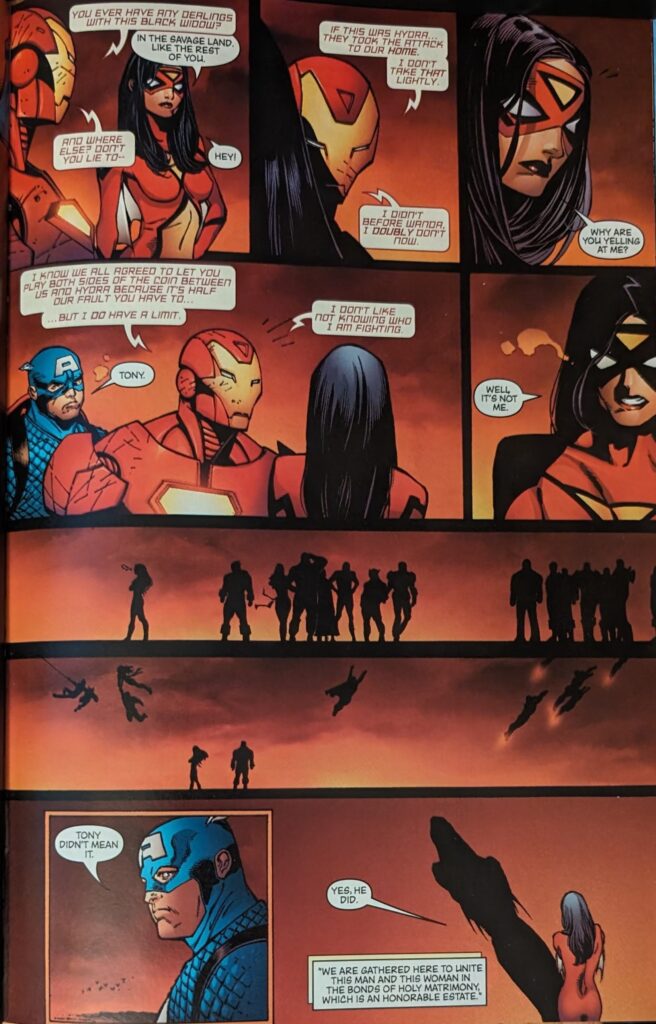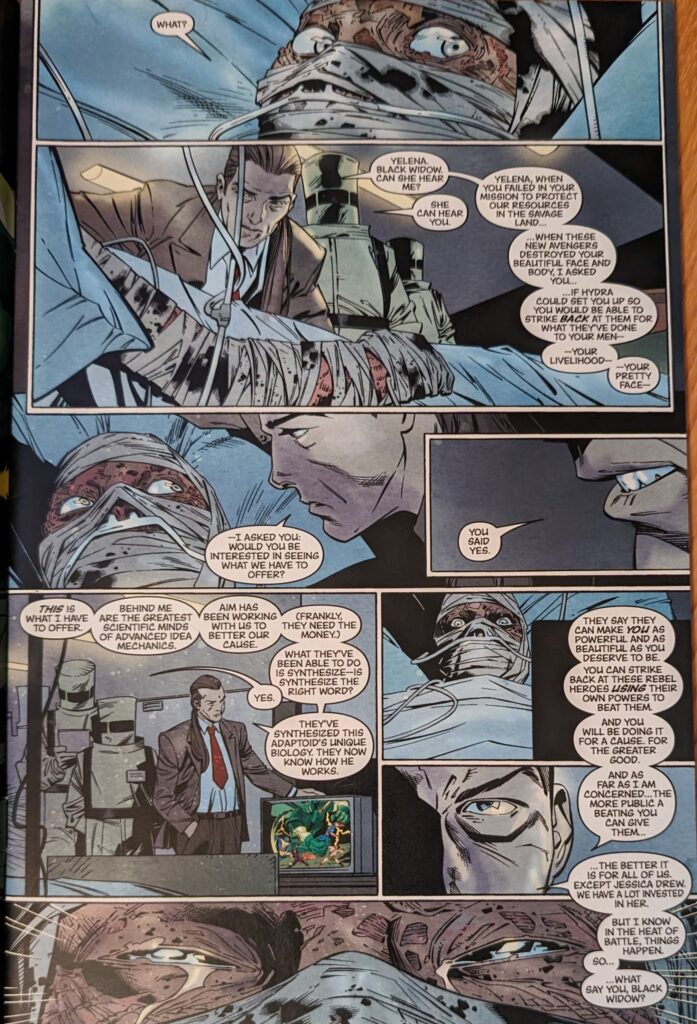 Using the Void against her is a very novel application of Bob’s whole deal. Good call, Bendis! As Sentry/Void keeps turning the screw, we cut to the Hydra guy who’s controlling Spider-Woman, who tells AIM to pull the plug. Yelena feels it happening, tries to ask for help, and explodes. Everyone thinks Sentry killed her, but Iron Man knows she was destroyed precisely so he couldn’t study her.