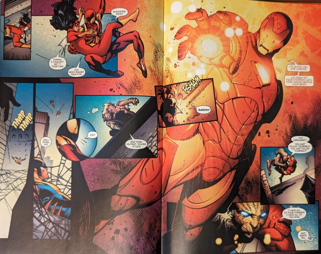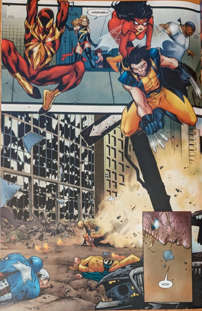 Also very much like that “I wasn’t done stalling yet!” joke. Bendis’ Spider-Man actually being funny was so refreshing in this era where so many people suck at it. I also note no one is drawing the webbing coming out of the back of the hand in this suit except Ron Garney. Spider-Man kicks Yelena in the butt to wake her up, then hops off the roof they crashed on just in time for her to get a Captain America shield to the face. He’s just bait, tho, running to get her in position to get zapped by Spider-Woman, and then Wolverine says “Now.”