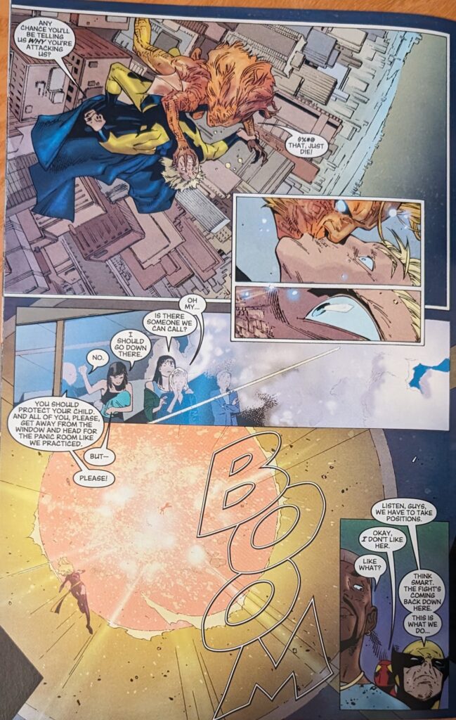 Coipel really seems to be having fun with that baby. His work has become so fussy in the last 20 years. I miss this cartooning. Carol wallops Yelena, who just gets back up and seems to adapt into her. Then she sends all the Avengers flying like Sentry, saying she really wants to get her hands on Captain America. But Cap has bundled the mayor into the back of a car and is fleeing the scene, assuming the attack is on him, not the Avengers. Yelena pursues, thanks to her batwings, which, like, which Avenger is that from? But then she gets smashed into a building.