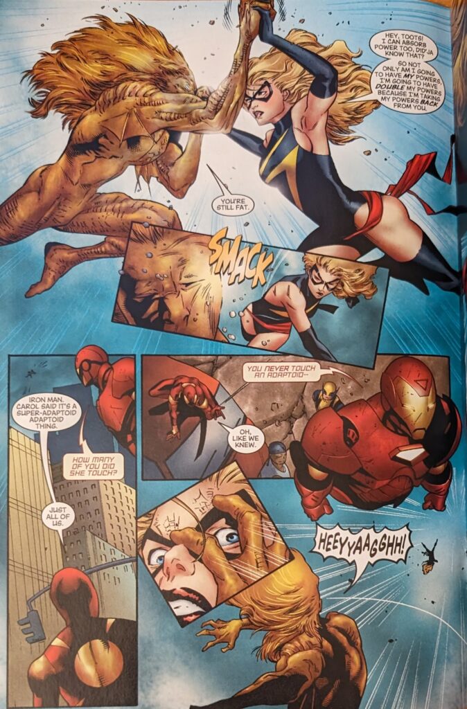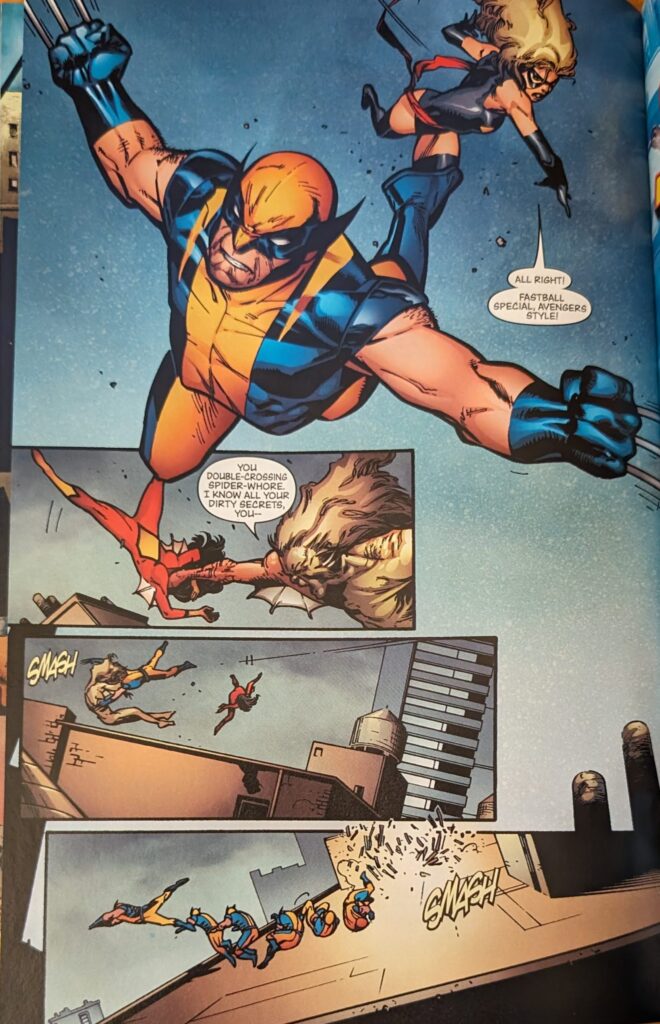 I think it’s funny that throwing Wolverine has become such a go-to gag when he weighs so much more than a regular person due to being full of unbreakable metal. I mean, nothing Colossus or Ms. Marvel can’t handle, but still. Throwing anyone else would be easier. Cool roll action at the bottom there.