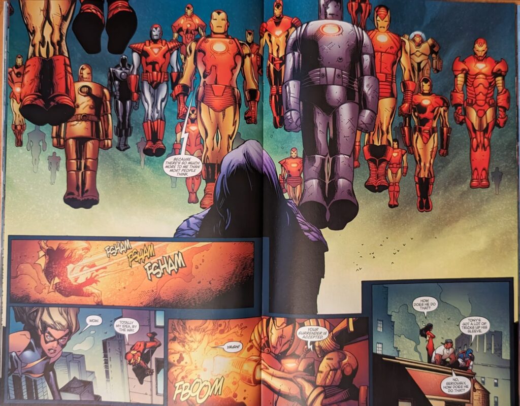 Can’t go wrong with the ol’ “army of armors” gag. Clearly differentiating between the 1st Adi Granov suit and the Extremis suit feels like showing off when Mike Deodato and Dave Finch couldn’t even draw one of them or keep them straight, but Coipel is top tier. Tony’s not in any of the suits, he’s on a nearby roof coordinating them all. But Yelena manages to even start turning the tide under this onslaught, noting she has Wolverine’s healing factor and Cage’s unbreakable skin.
