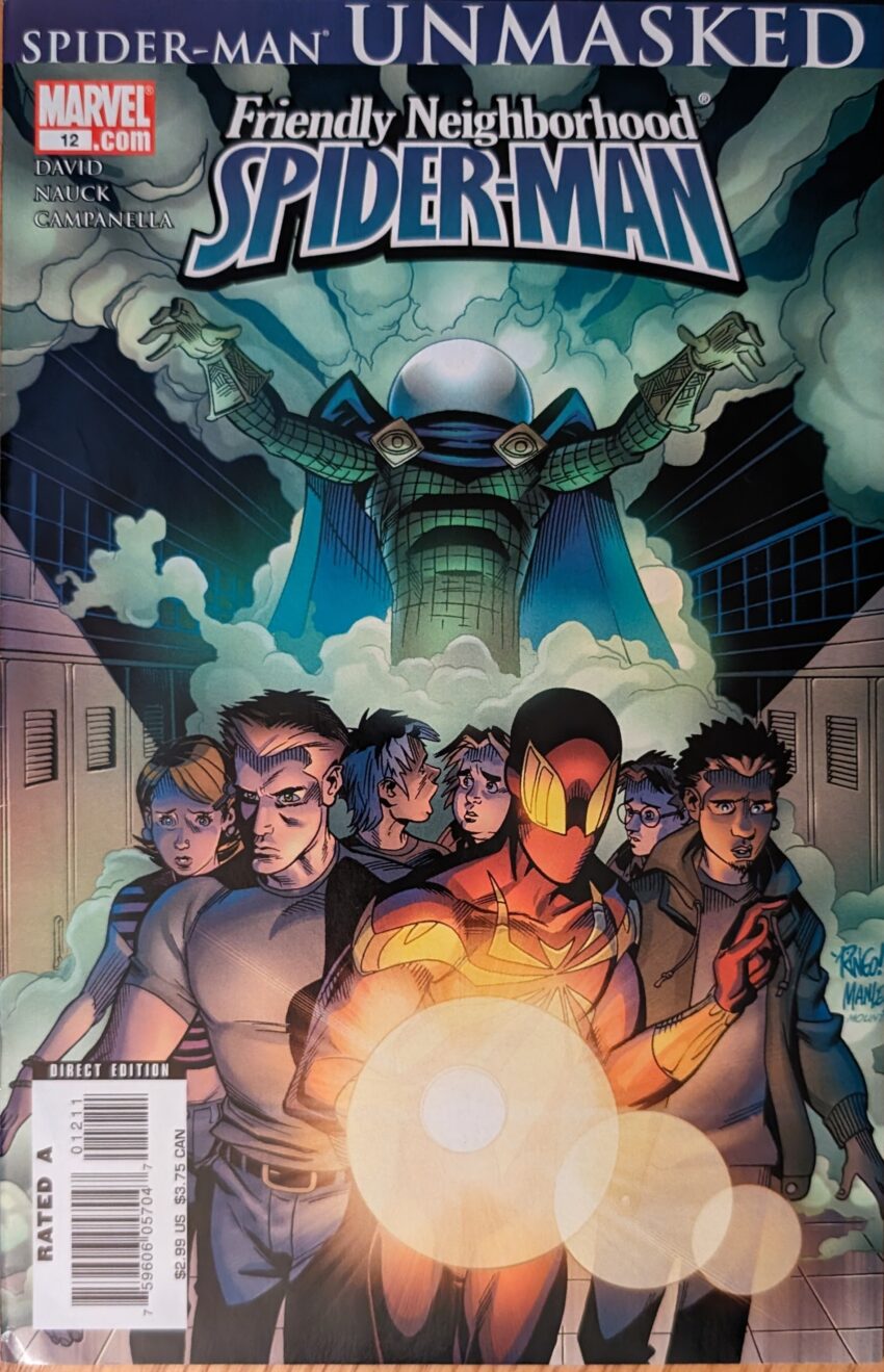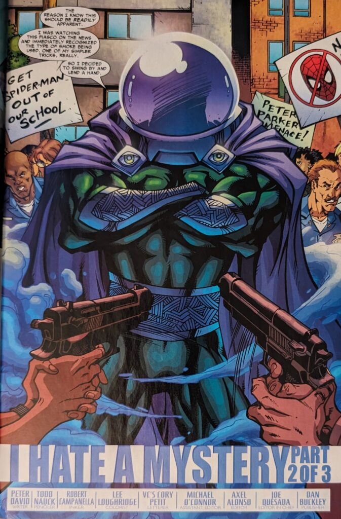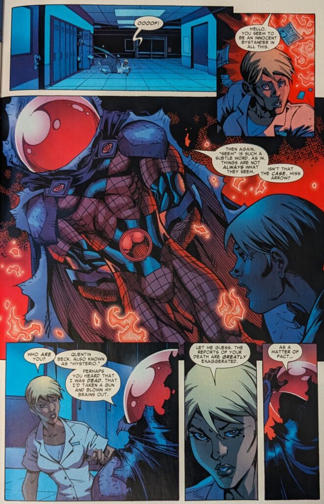 Hey, those bottom 3 panels are the first bit I’ve liked in this issue. Casual superheroing. Back with Flash, Jeremy the nerd saves Flash from being dragged into the floor by stabbing the monster’s tentacle with a Swiss army knife he’s not allowed to have on campus. But, obviously, Flash decides he doesn’t want to report him. Then that Arrows lady does some Komedy Bits about the Swiss making a lot of knives for a neutral country until she is mercifully dragged into a locker. Well, anyway, Spider-Man has finally reached Mysterio III, but before they can scrap, Mysterio II appears, announcing his intention to help Spider-Man beat up Mysterio III. In the Official Handbook of the Marvel Universe, they always identified legacy characters like this. It seems very helpful in the context of this issue. As for the alleged Mysterio I…