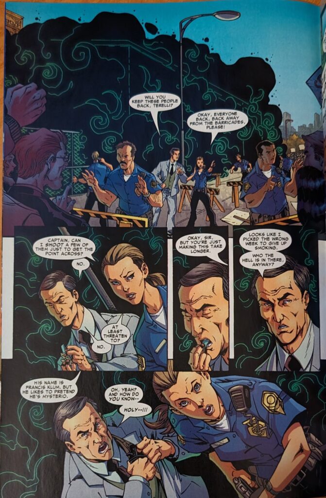 This Mysterio, presumably Berkhardt, says his helmet will allow him to enter the cloud, and the enemy of my enemy is my friend, and then he goes in. Cop guy says maybe they’ll get lucky and the Mysterios will kill each other. Maybe! Inside, Spider-Man is suddenly enveloped in a gas. He thinks Mysterio wouldn’t know the new suit protects him, and beings overacting being scared until his boss walks up and wonders what he’s doing. Komedy business. Then his Spider- Sense goes off.