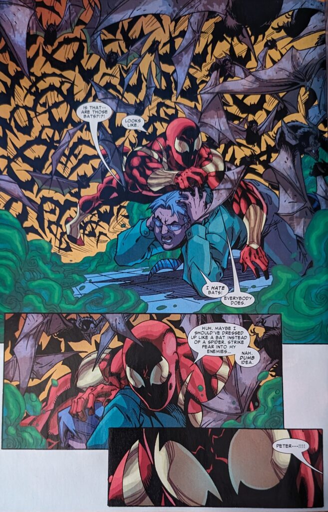In the 90s, Peter David and Todd McFarlane had a very public spat that ended in a farcical “debate” between them at a Comic Con, about what’s more important, story or art. David redoing the cliffhanger from McFarlane’s Spider-Man #3, using the OTHER of my 2 least-favorite Spider-Man villains, complete with the exact same headwound on the exact same side of his head, is kind of embarrassing. The answer to that debate, by the way, is neither. A badly drawn comic is disappointing and a poorly written comic is disappointing. You can grit your teeth and read a good story with bad art (Boy, have I!), or you can appreciate beautiful art telling a bad story (Boy, have I!), but neither of these scenarios is a good comic book.