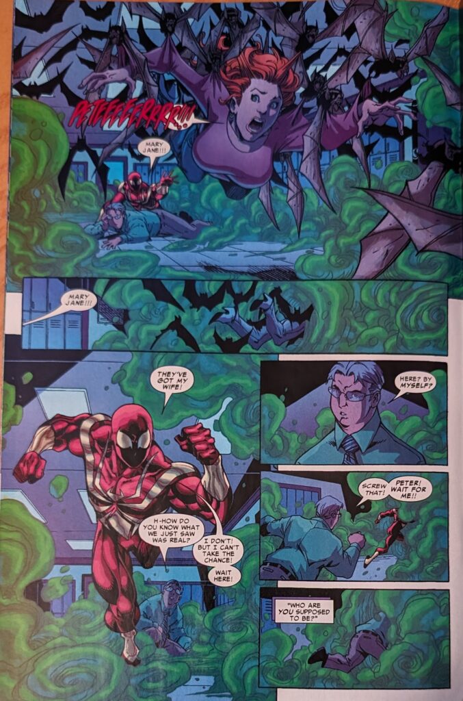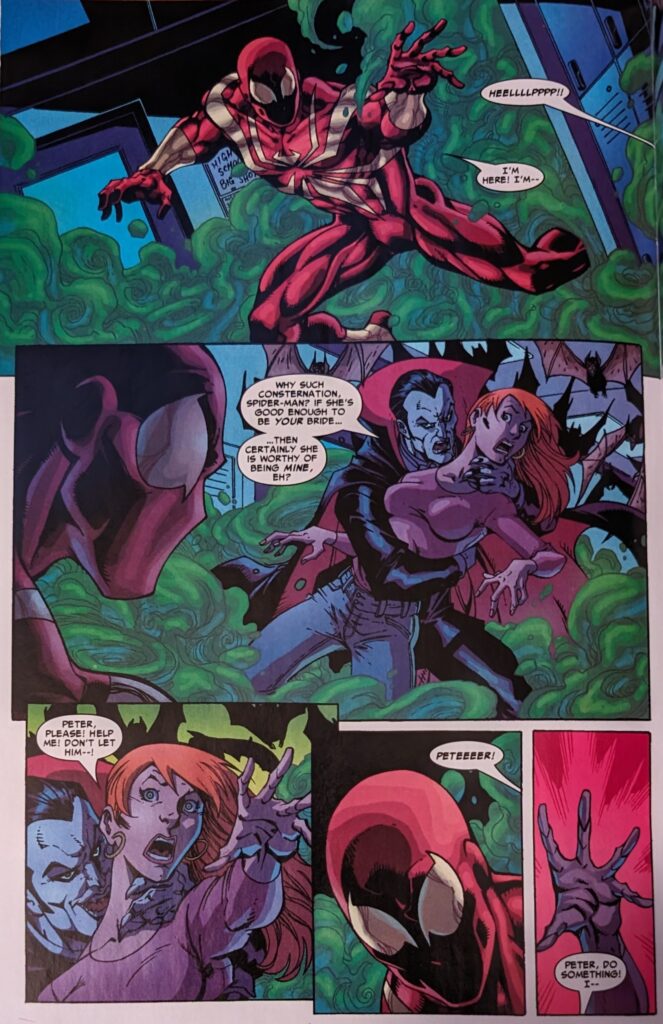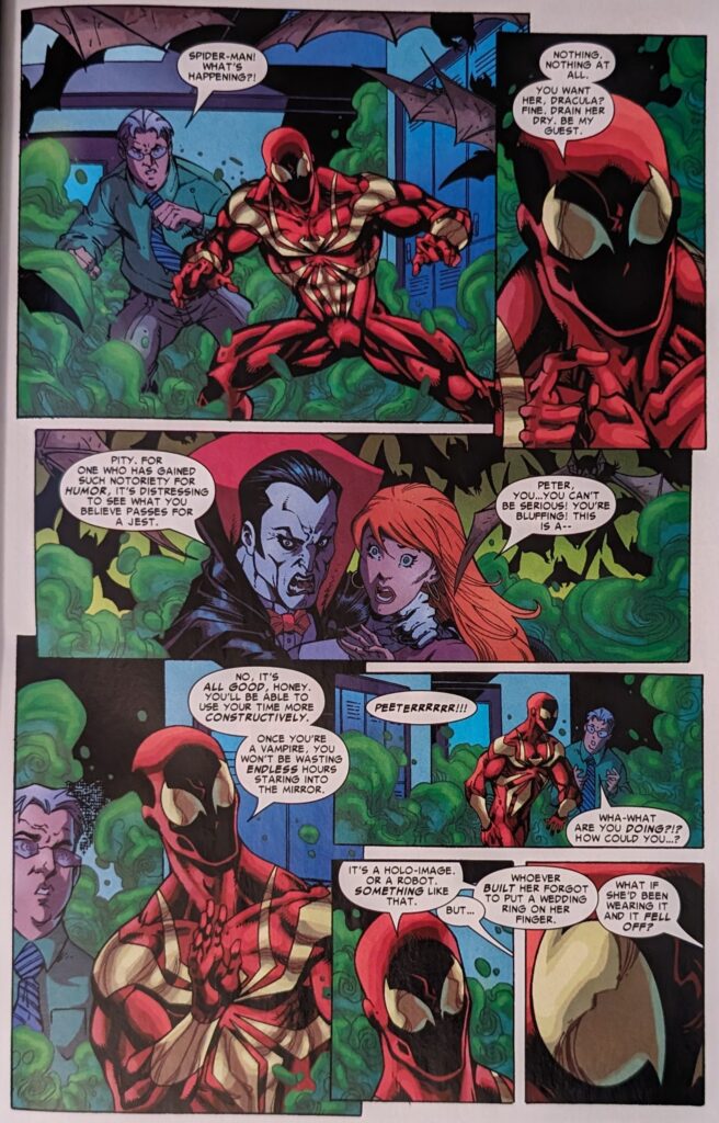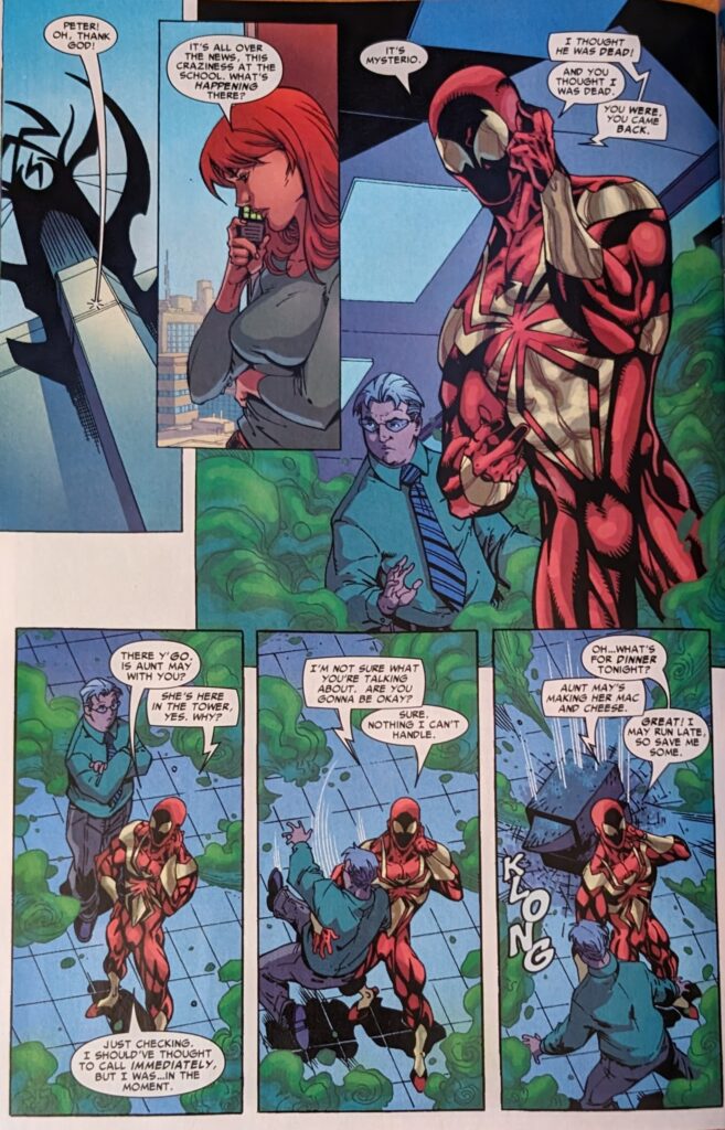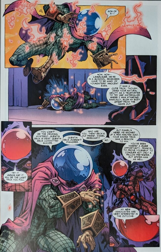 Somehow, Spider-Man identifying MJ as his wife is much more surreal than people addressing Spider-Man as “Peter” to me. Meanwhile, in the auditorium, Demonic Mysterio or whatever is insulting Mysterio III, who tried to teleport and gets injured.