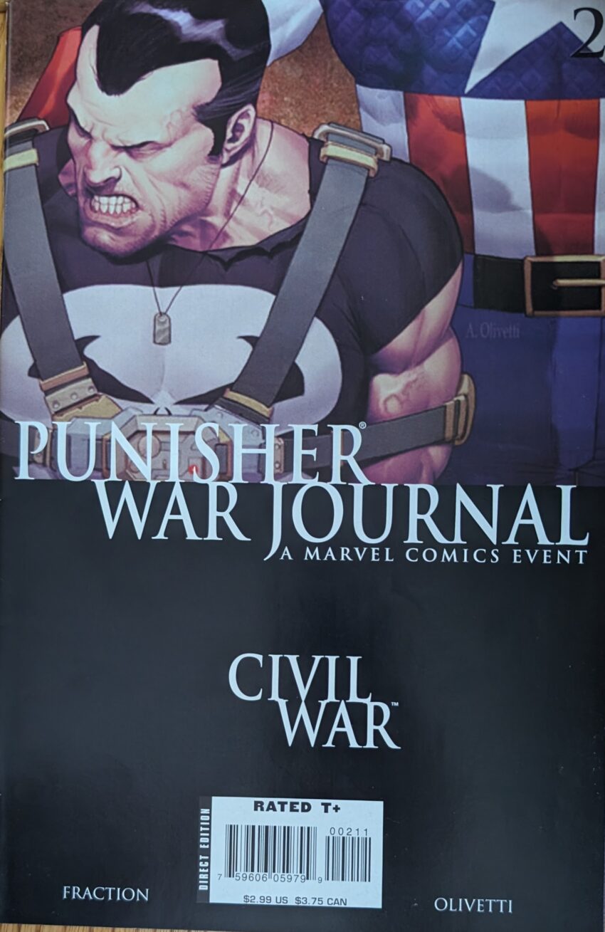 More punishing time, and given that Spider-Man’s in these, but not much, we’re just gonna take them all in one post. Like so many comics, these take place in some nebulous time during Civil War 6. Furthermore, #2 seems to pick up where PWJ 1 left off, but Spider-Man appears in his red & blues, meaning some time has passed. Who knows anymore? An event with so many tie-ins is hard to keep track of. If memory serves, this is also where I have problems with this comic. It opens with Cap and Frank debating whether he should be allowed to work with the team, whose methods make more sense, etc. Outside, Patriot, Hulkling, Vision and Luke Cage wait, Patriot eavesdropping against the door (With a funny aside of Luke Cage being an old head to Patriot about bass) until Cap punches Frank right through the wall, announcing that if he stays, he can only use nonlethal means.
