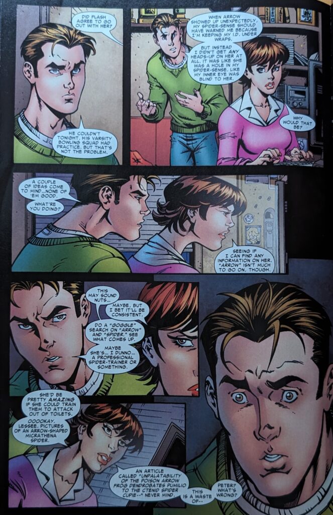 Why… did he get into Spider-Man position on the couch? Weird thing to say, by the way, Betty. I don’t know, first loves and all. How funny would it be if she was still the insane, manipulative lunatic she was as a teen during this story? Well, Peter starts talking about how he was chatting with Flash at school (WHEN DID THIS HAPPEN) when Arrow appeared.