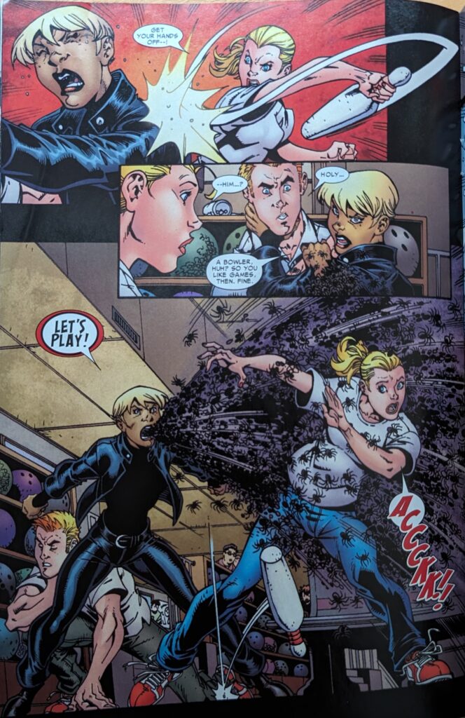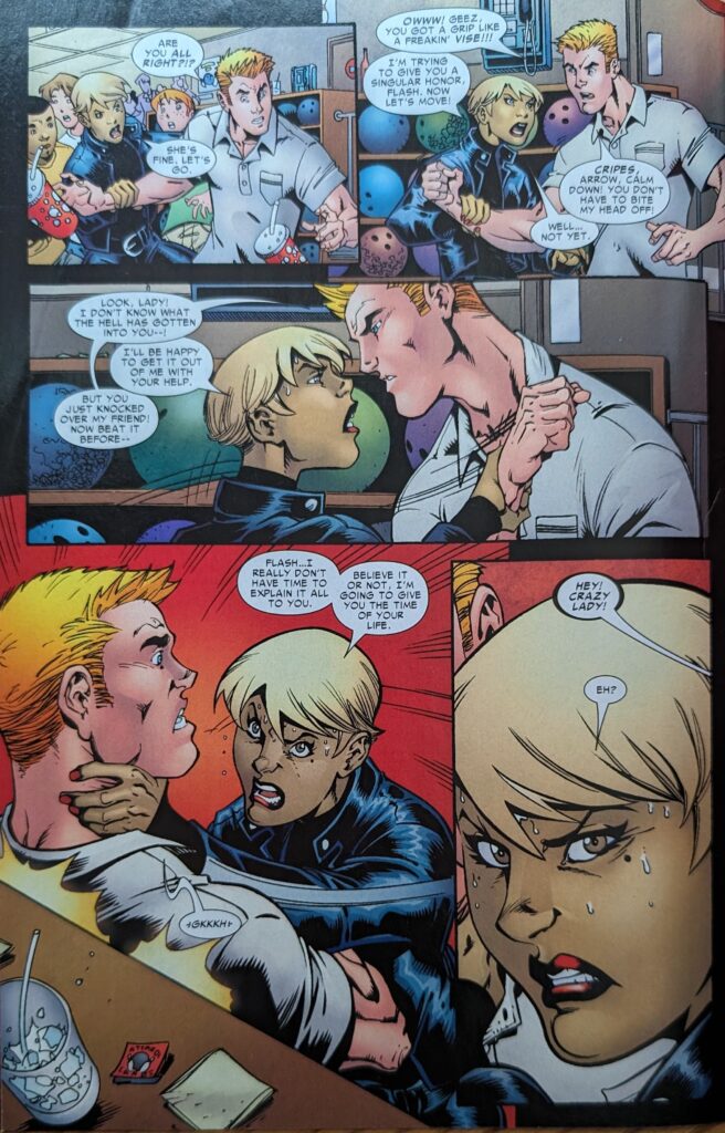 That’s so stupid. That’s so stupid! Why would she use a cutesy nickname? This isn’t as stupid as Geoff Johns having Red Skull infiltrate the US Government under the name “Dell Rusk,” but it’s close! Ugh, anyway, “Arrow” goes into the bowling alley and demands Flash leave with her. She’s introduced to Kelly Kulick, pro bowler, never seen before or since, “old friend of Flash’s.” Arrow won’t take no from either of them when demanding Flash leave, and pushes Kelly over the ball return thingie in her mounting anger.