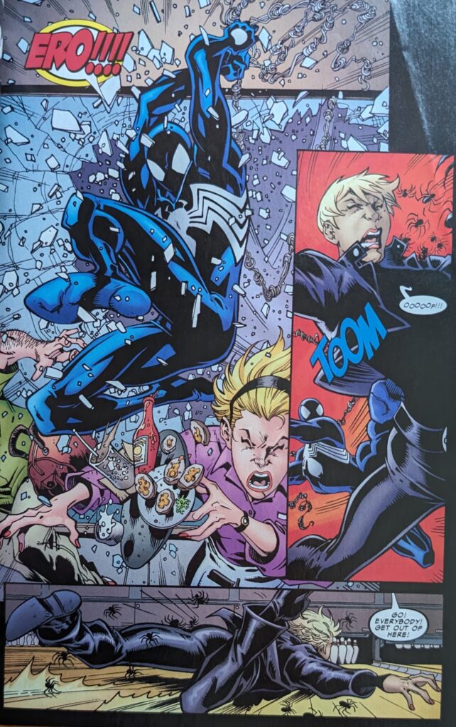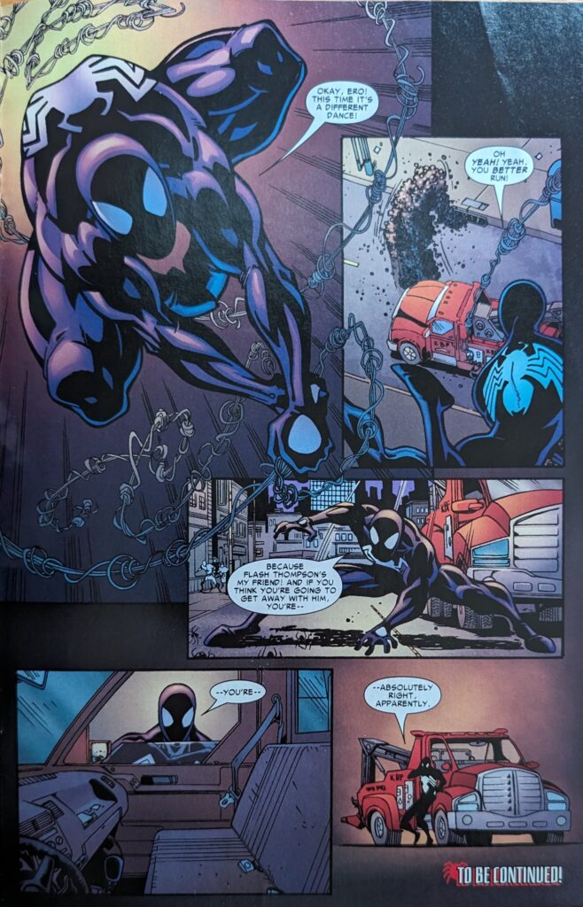 I think I’ve just kind of been struck speechless. I sure had no idea the Other would keep making comics suck this long after it was over. Outside, Flash & Kelly are trying to escape in her truck, when a giant tower of spiders lifts it into the sky. Like… come on. How many spiders can this lady be? Flash demands Arrow let Kelly go, so of course it chucks her out of the truck, only to be saved by Spider-Man.