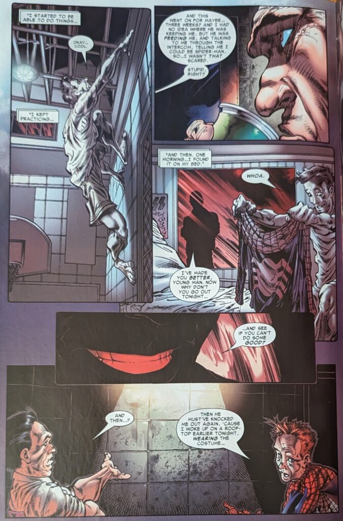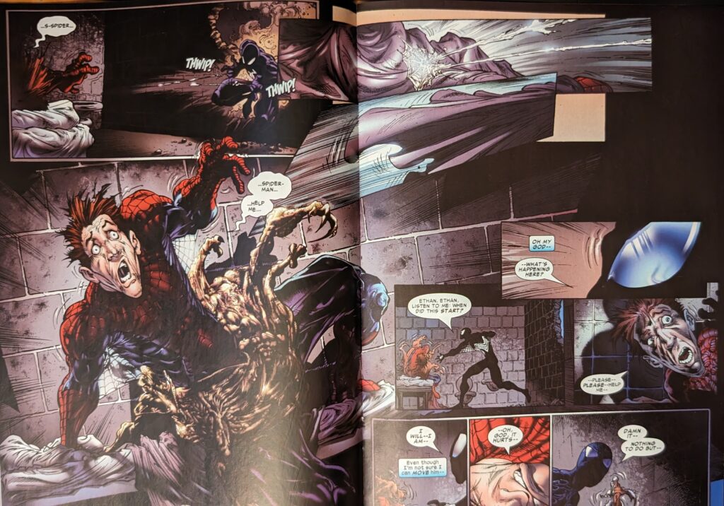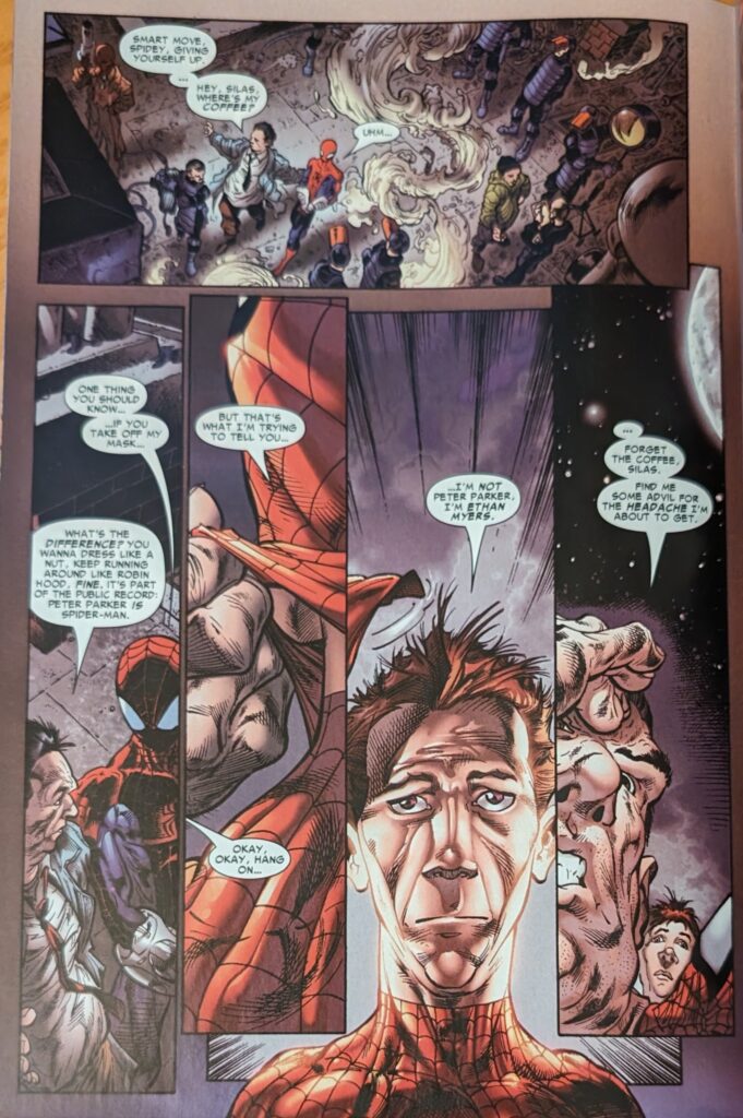 No idea what Nurse Palmer is talking about. Nurse Palmer is the only character I’ve literally ever looked up who doesn’t have a wiki entry, is this just supposed to sound like a reference, but not really a reference? Uh, things take several turns for the weird then, and Spider-Man takes off with Ethan’s blanket, thinking his family has been put through the ringer, with a panel of May and MJ as they appeared the night May was shot. As if this takes place before? Which would make SO much more sense, but can’t be true because of the suit? And the other weird thing is, he takes the blanket to Curt Connors to try to figure out what changed Ethan. I think… I think Reed both can handle that better, and would figure it out in the course of trying to save Ethan. And THEN we see another new Spider-Man testing his powers. Whoever’s doing this is really getting his money’s worth out of the process.