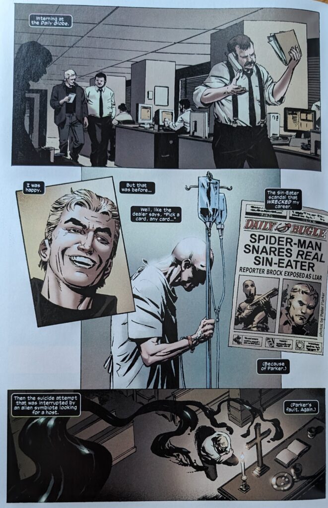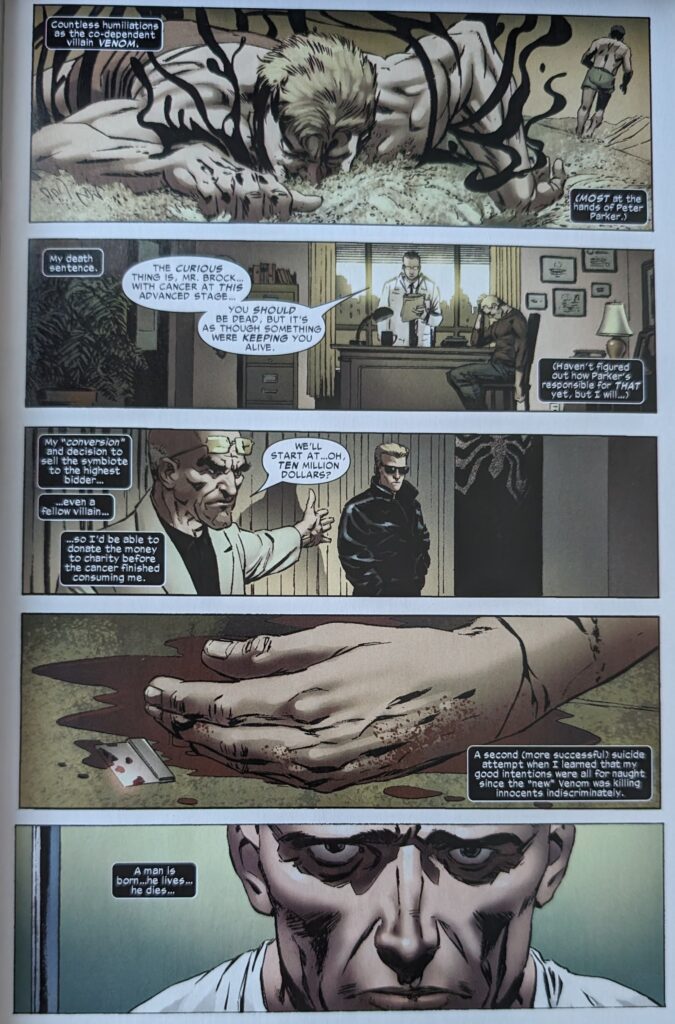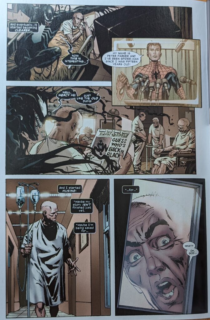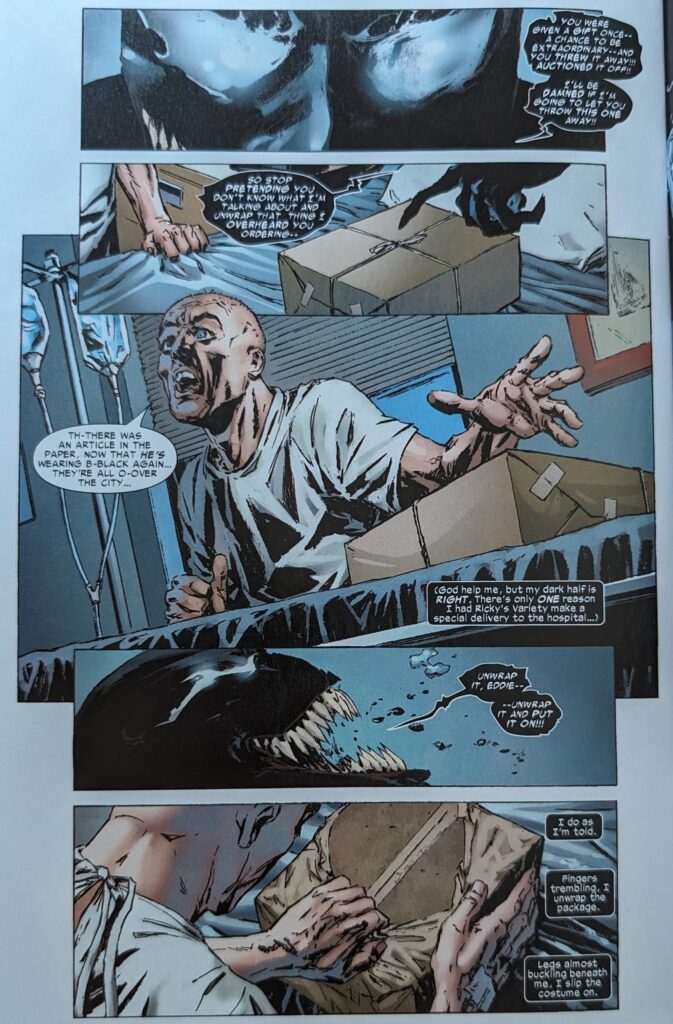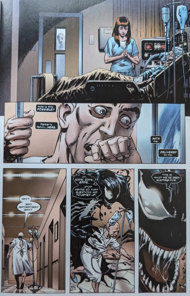 Flashbacks to ASM 300 & 317 and MKSM 6, of course, mixed in with the stuff that wasn’t depicted. The specter of Venom taunts Eddie throughout his day, saying some part of it will always be inside him, and it’s waiting for him to die, so the doctors can “slice you open and set me free.” It also characterizes their split as his idea, even tho it tried to leave him in TAC V2 5, couldn’t, then suddenly could when Millar came along with his characteristic lack of interest in continuity. Bit of “I don’t want you, you don’t want me” with these 2, really. But, Eddie thinks, he’s held on. And he wonders why. If he’s meant for some higher purpose.