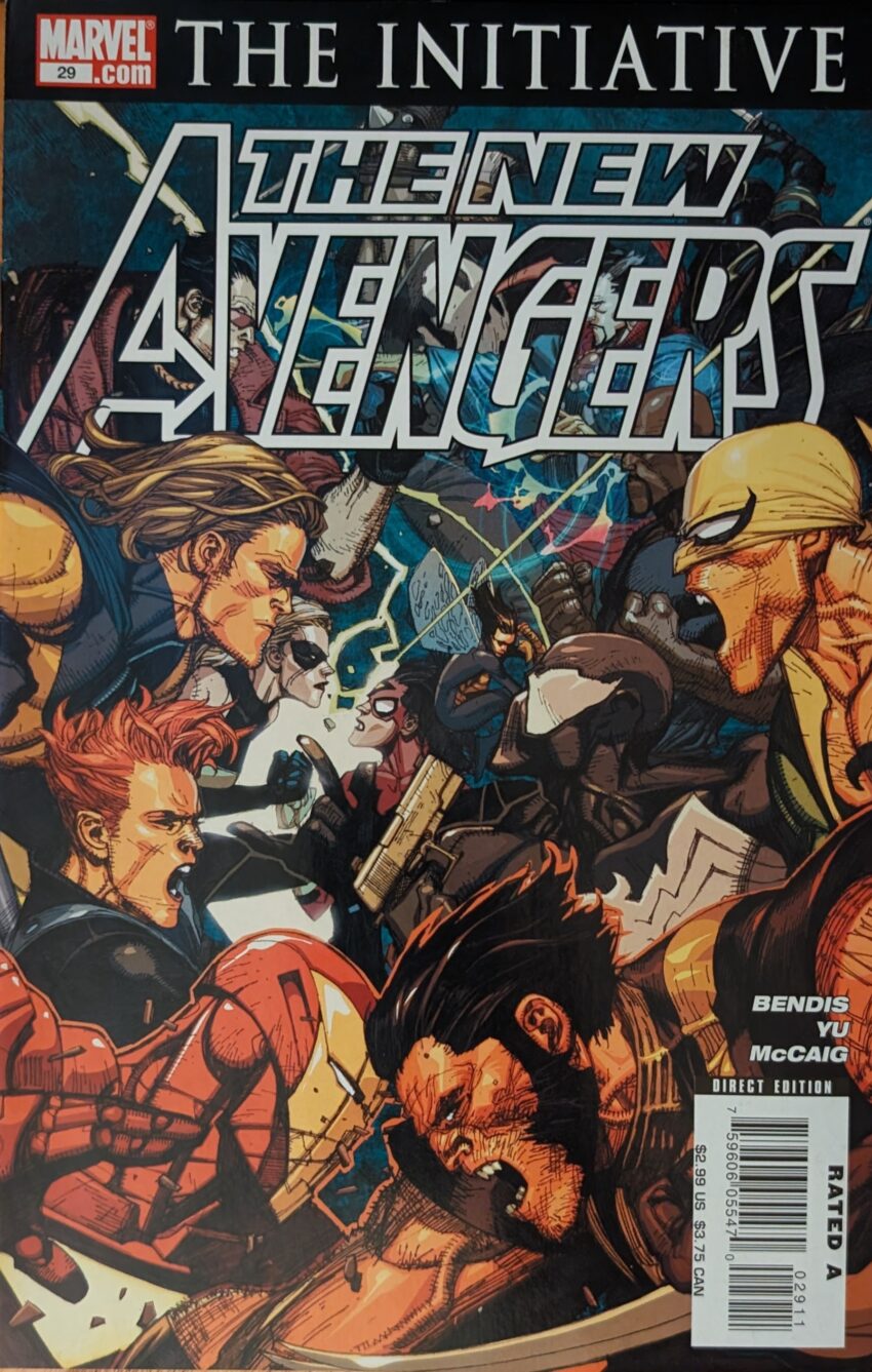 Avengers Vs. Avengers! A running theme during these “Initiative” branded issues. Wel, the Hand busts in on the New Avengers, and Spider-Man says “Maybe we should go back and fight Brother Voodoo.” Then we flashback to the 2 Avengers teams sizing each other up at the Raft, where Tony tells them they’re all under arrest.