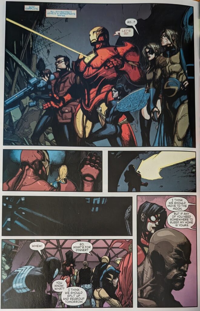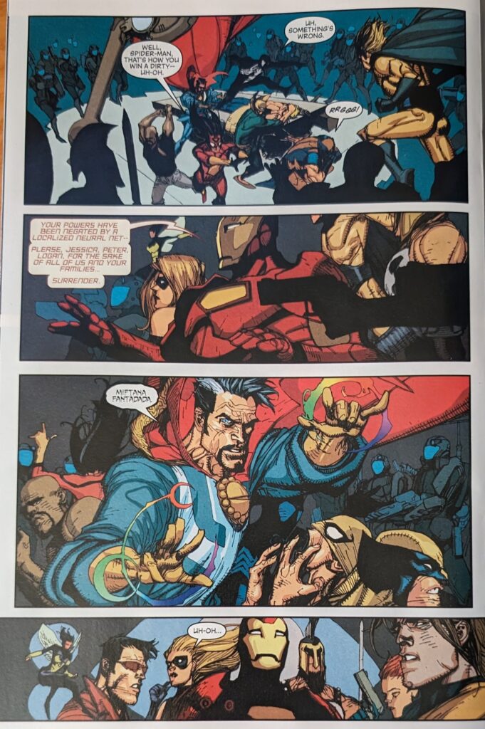 They finally managed to get Ares, God of War in there. He was a bit player in Thor and Hercules material over the years who was elevated to the big leagues for this team. Very different than those other gods. Well, Doc Strange makes all the Mighty Avengers see their worst nightmares. Sentry sees the Void, Wonder Man sees his brother, Grim Reaper, etc. Iron Man sees a zombie Captain America. Then they all wake up and realized they got got. The News were teleported back to Dr. Strange’s house, where they told Jessica it was a trap, then didn’t know what to do. When the Mighty team shows up looking for them, Strange casts a glamour that makes the inside appear empty, even as the New Avengers are there.