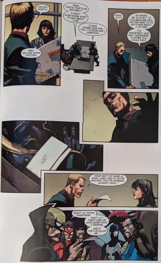 Jeryn Hogarth there completely outmaneuvers Iron Man twice and forces them to leave empty handed. Then Dakota North shows up. Last seen ‘round these parts in Web of Spider-Man 37! She’s now working as an investigator for Nelson & Murdock. Matt will have an affair with her while his wife is in the hospital for mental issues. He’s quite a guy!