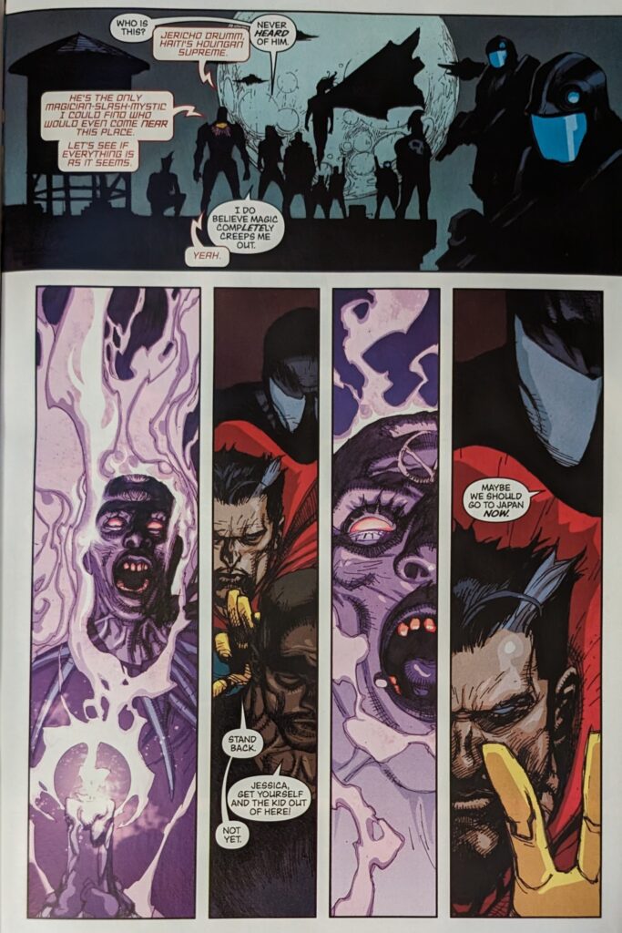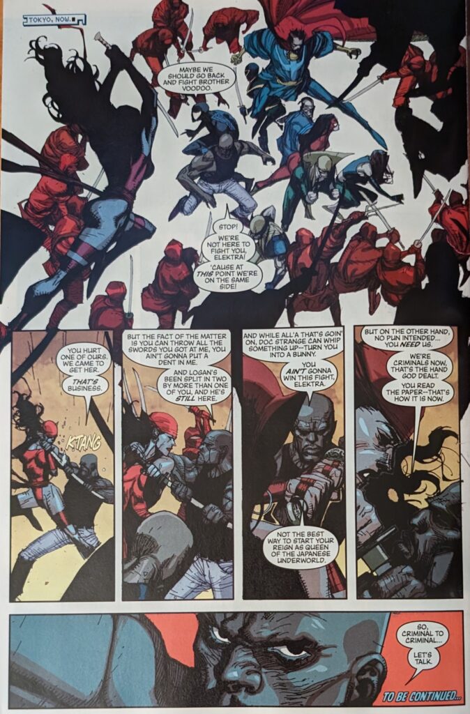 So they decide to get to Japan by having Strange teleport them into Danny’s private plane. Wolverine says they may have to get their hands dirty if they want to effect real change in Japan, and if the others aren’t willing to go that far, they shouldn’t come at all. Then Strange senses something.