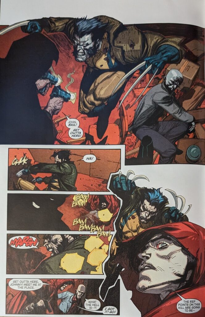 Bear in mind, this issue came out 4 months before Mighty Avengers 7, which will soon seem disgraceful. Strange cover. If there’s an explanation inside, I’ve forgotten it. We pick up a second after the end of NA 33, with the Hood shooting up Wolverine.