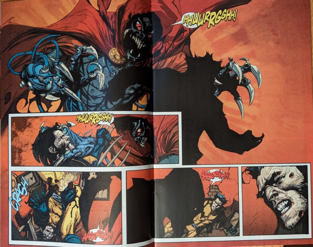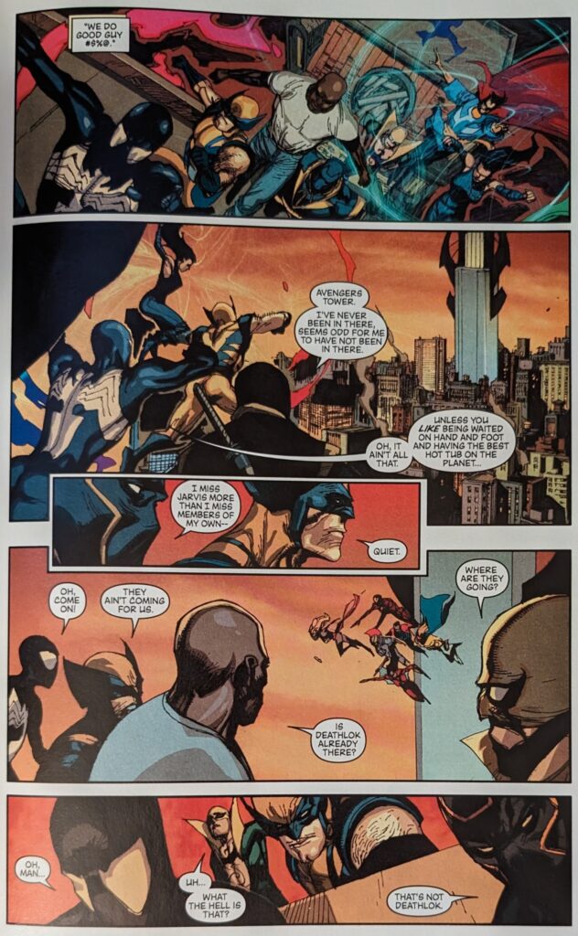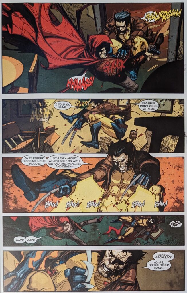 I mean, that would’ve maybe been better if it wasn’t on the cover, but there we go. Everyone seems to be who they say they are. Also, one of Matt Murdock’s ex-girlfriends/ex-enemies is going to become a Daredevil, but it’s not Maya. Logan is here to tell them about the Hood, and Spider-Man says he knows that guy. I had to look that up. They met in a miniseries called Beyond! Written by the great Dwayne McDuffie that I didn’t buy because it was drawn by the not-great Scott Kolins. Maybe I should go back and get it. One skips something like that assuming the author won’t die tragically young and he’ll have plenty of material to look forward to. One can be wrong. Logan tells the gang that the Hood is planning to send Deathlok to attack Avengers Tower.